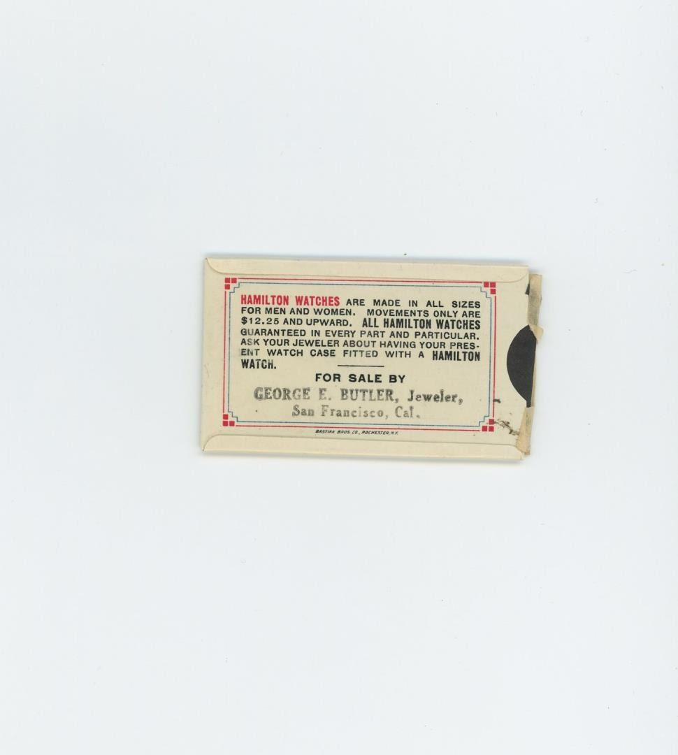 Advertising for Jeweler and Hamilton Watch Dealer George E. Butler from San Francisco, California. 1 3/8" by 2 3/8".