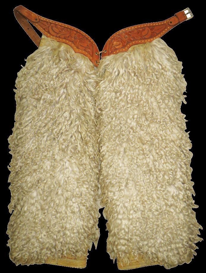 Stunning bright white angora chaps with great long twisted hair, and light colored flower carved belt.