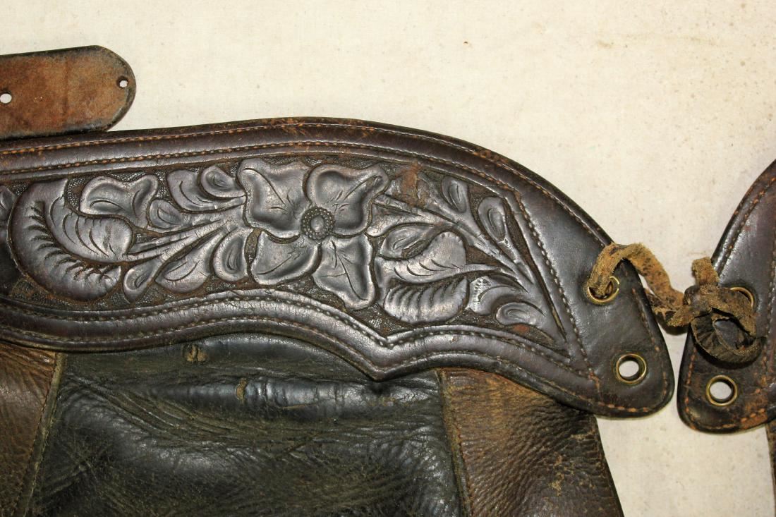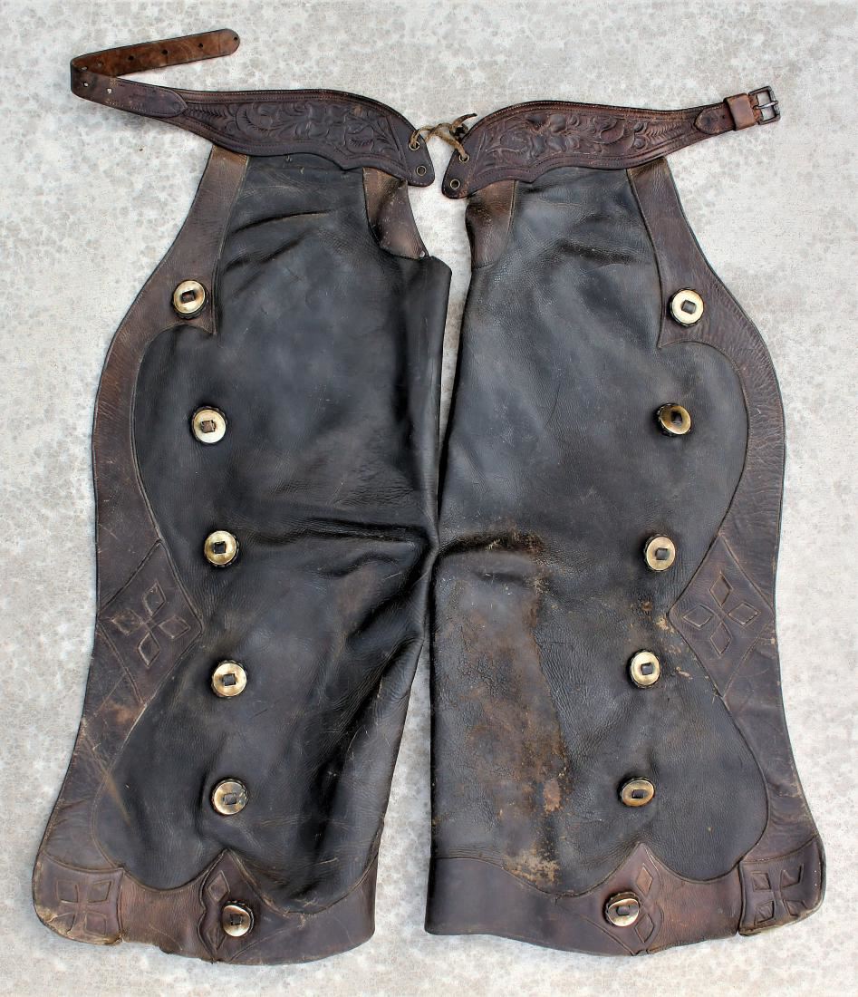Extra large two tone batwing chaps, decorated with cut-out overlaid wings and nickel conchos.