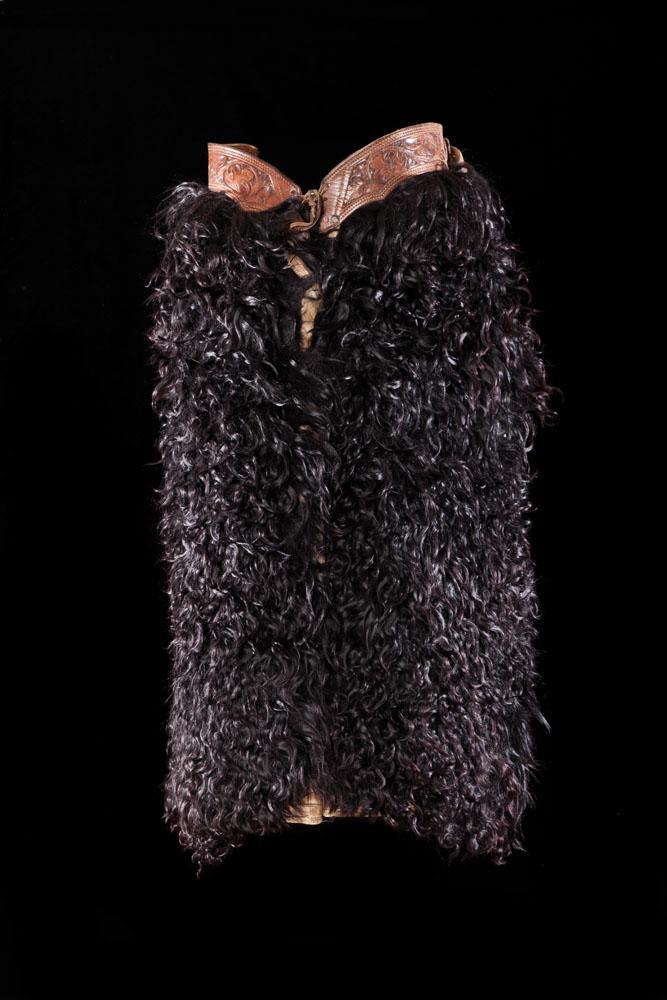 Canvas lined, leather backed lustrous black batwing angora chaps with elegant floral tooling on the regal billet. Superb condition, c. 1920s.
