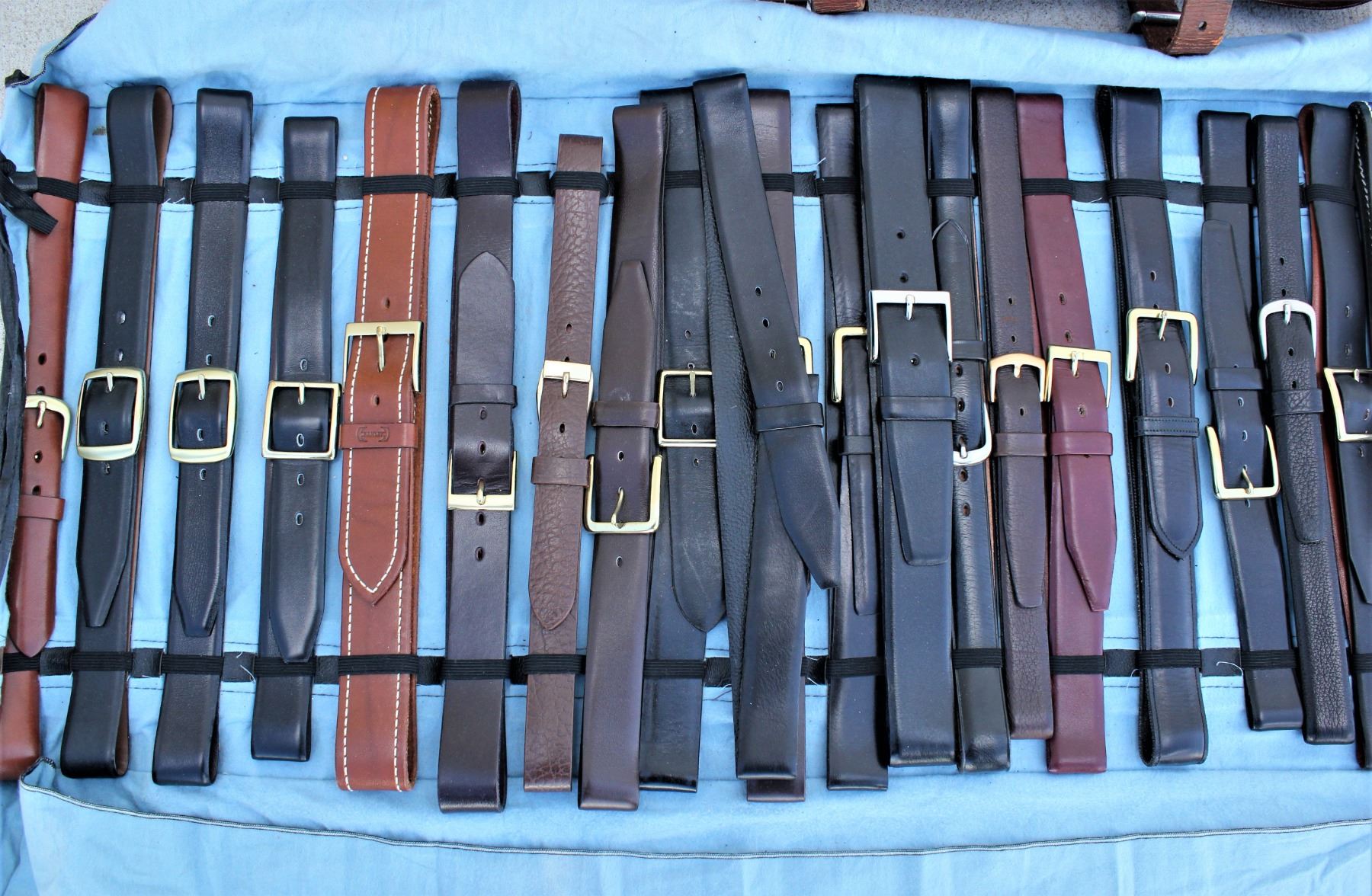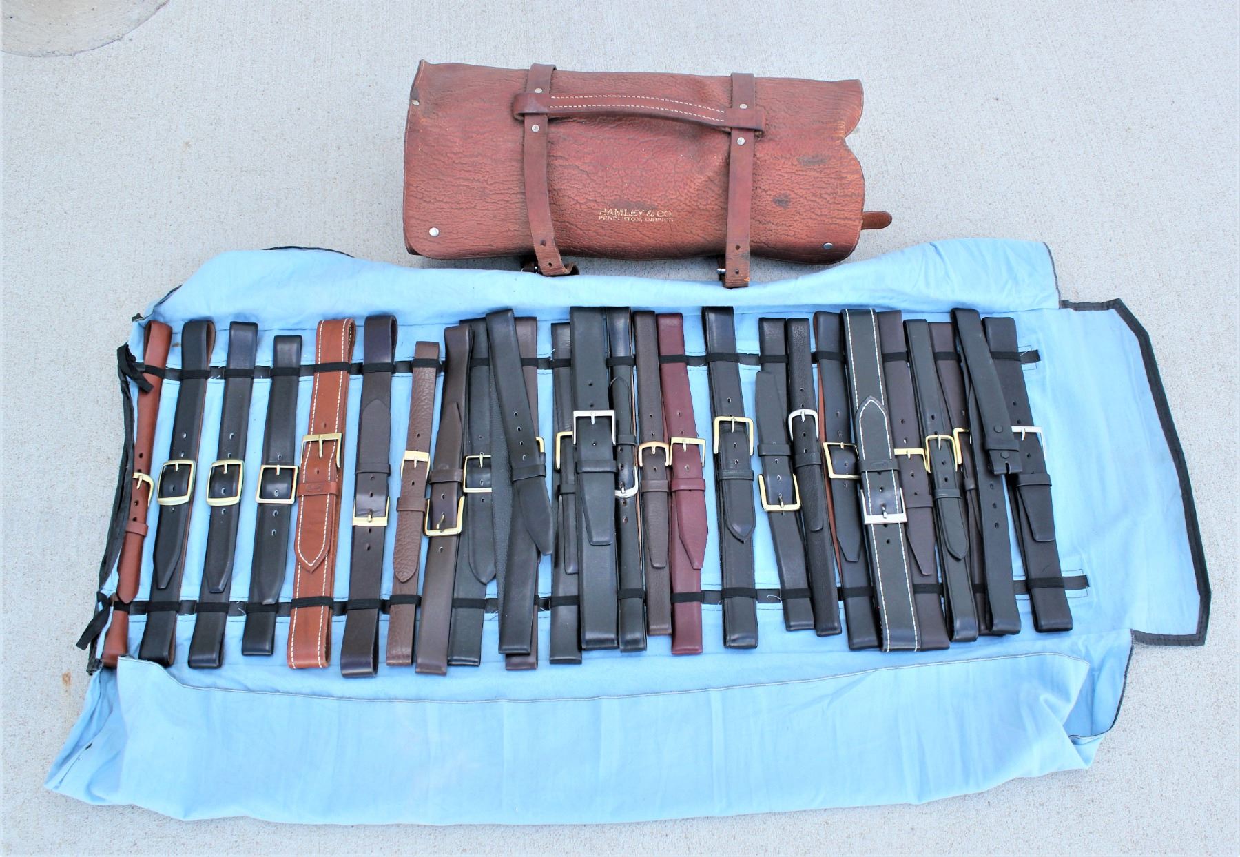 A fantastic saddle shop item from the iconic Hamley Saddlery, leather traveling salesman's case that unfolds to display all of the styles and colors of belts offered by Hamley. Nicely made, with maker's stencil on front, velvet lined and containing 25 belts.