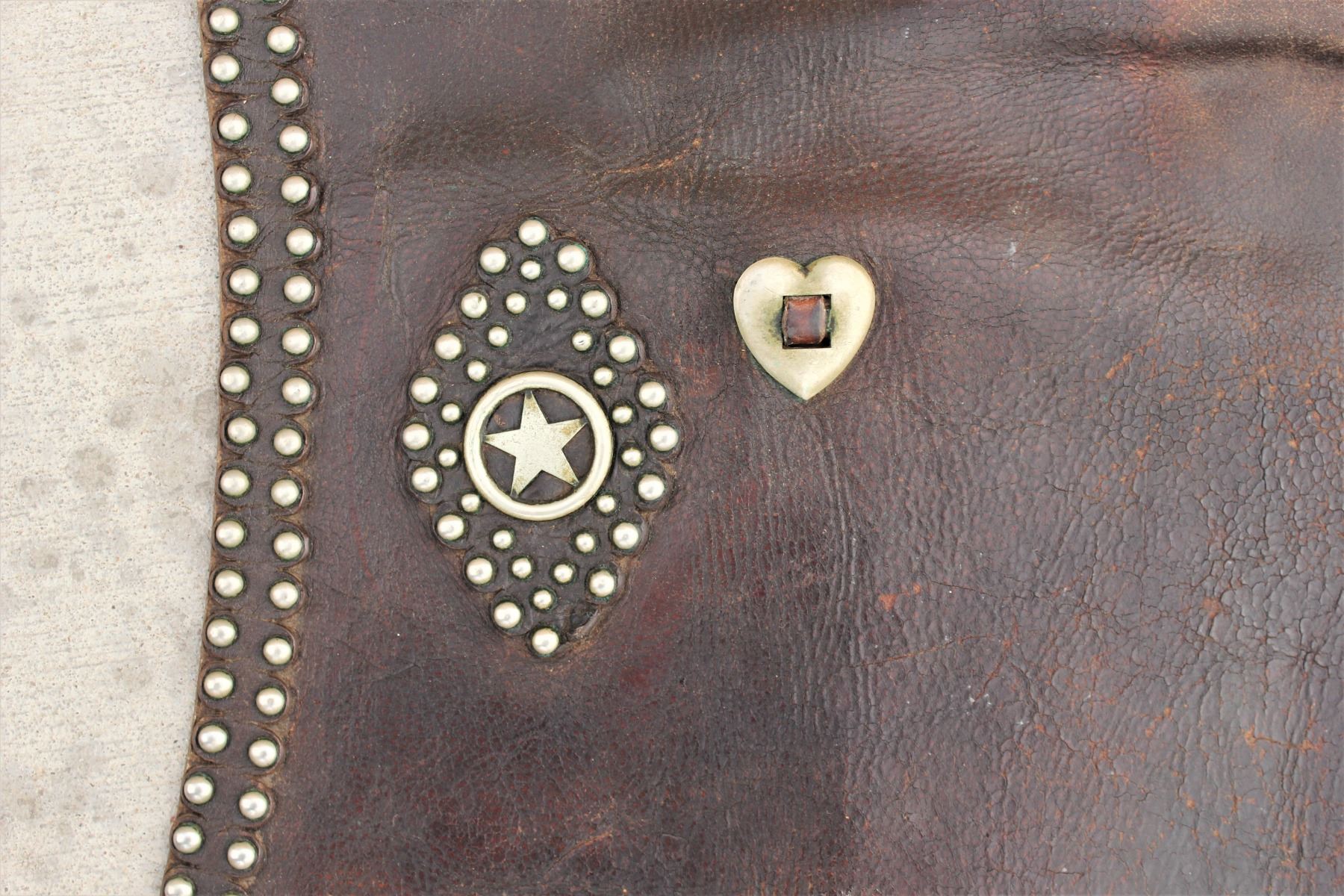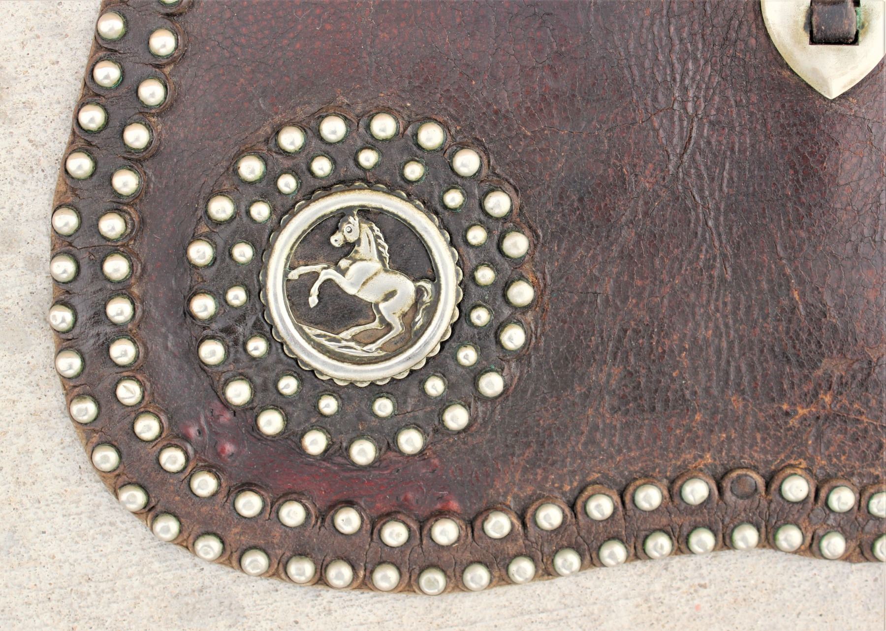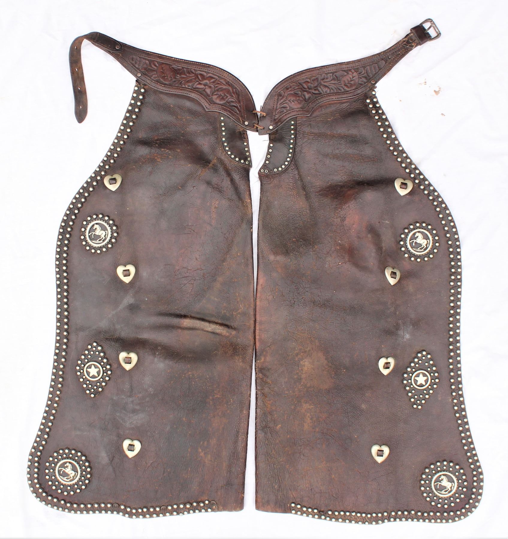 Striking pair of custom made one of a kind batwing chaps with great stud pattern focused around fabulous cut-out rearing horse conchos, finished by a nicely tooled bet.