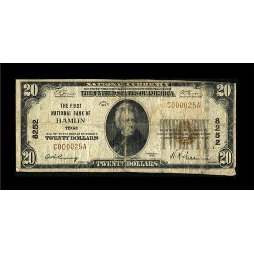 <B>Hamlin, TX</B></I> - $20 1929 Ty. 1 <B>The First NB</B></I> Ch. # 8252<BR> This is a seldom seen charter number. We sold a similar looking $10 on this Jones County bank in May 2003 for over $900. <B>Very Good-Fine.</B></I><BR><BR><b>Shipping:</b> Coins & Currency (<a target="_blank" href="http://www.heritageauctions.com/common/shipping.php">view shipping information</a>)