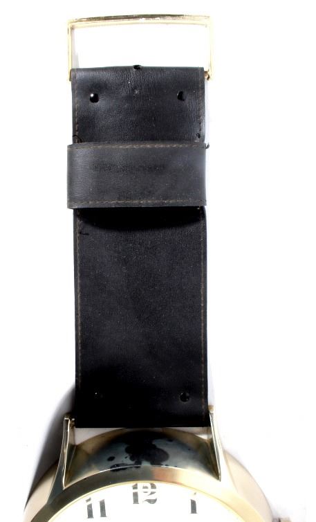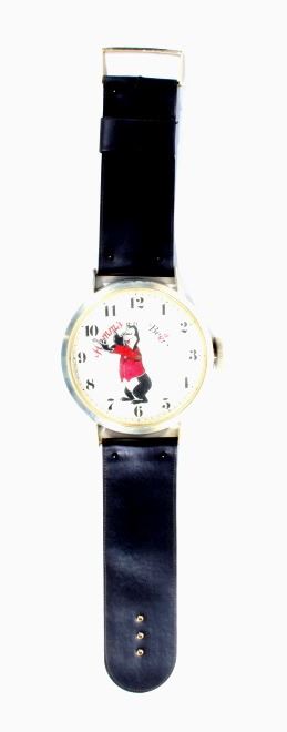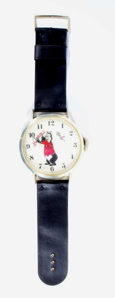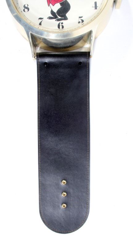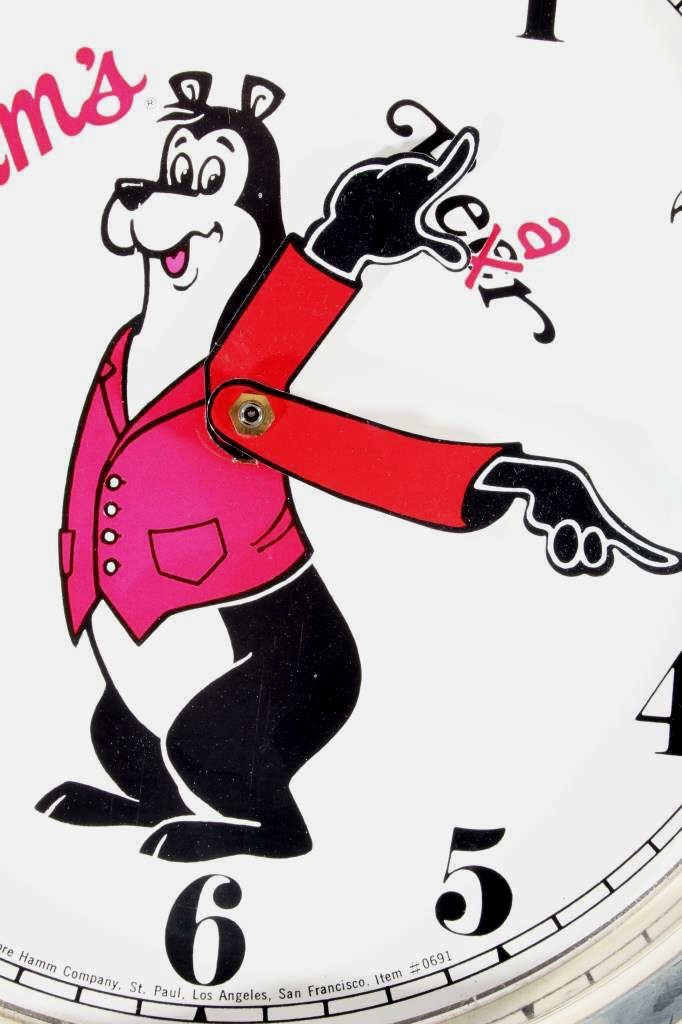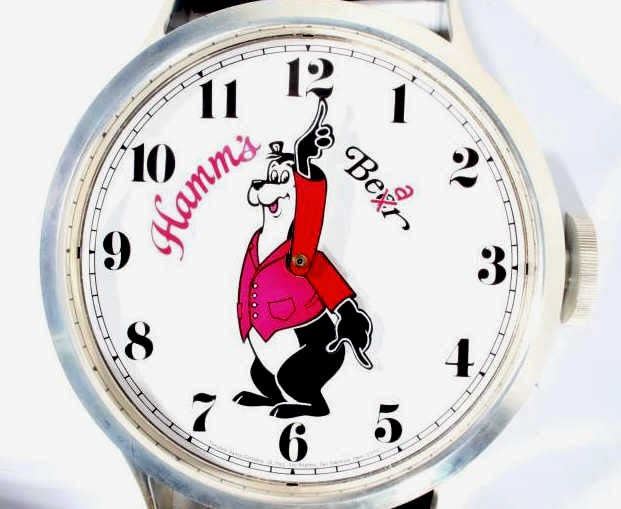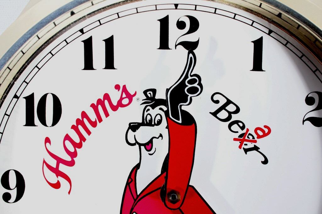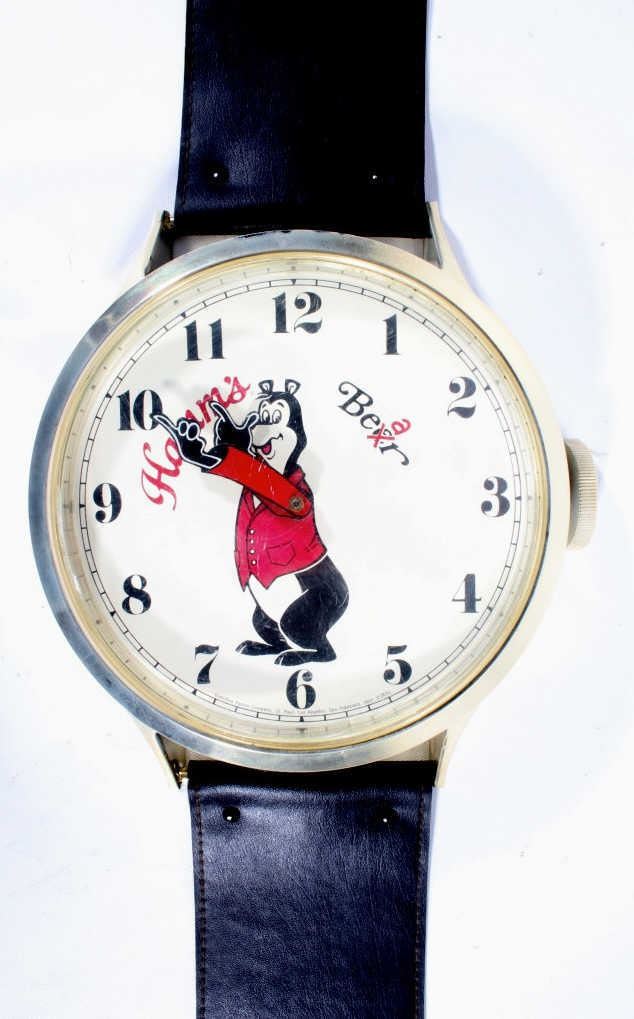 For your consideration is this bit of Hamm's Beer breweriana advertising. In 1865 German Immigrant Theodore Hamm purchased Excelsior Brewery in St. Paul, MN and gave it his last name. In the 1950's Hamm's created the Hamm's Bear and with it, one of the most successful advertising campaigns ever. The Hamm's Beer Bear appeared in television spots and was featured on a vast array of signs, glassware, and promotional merchandise. This 1960's wristwatch shaped clock would have hung on a tavern wall. It has a leatherette wrist band and a watch face featuring the Hamm's Bear in the center with his arms as the clock hands. The clock says "Hamm's Beer", having the second "e" in Beer crossed out and replaced with an "a". Arabic numbers are around the dial. This clock is in excellent overall condition. It runs and keeps time and is only missing the tang in the buckle of the oversized watch band.