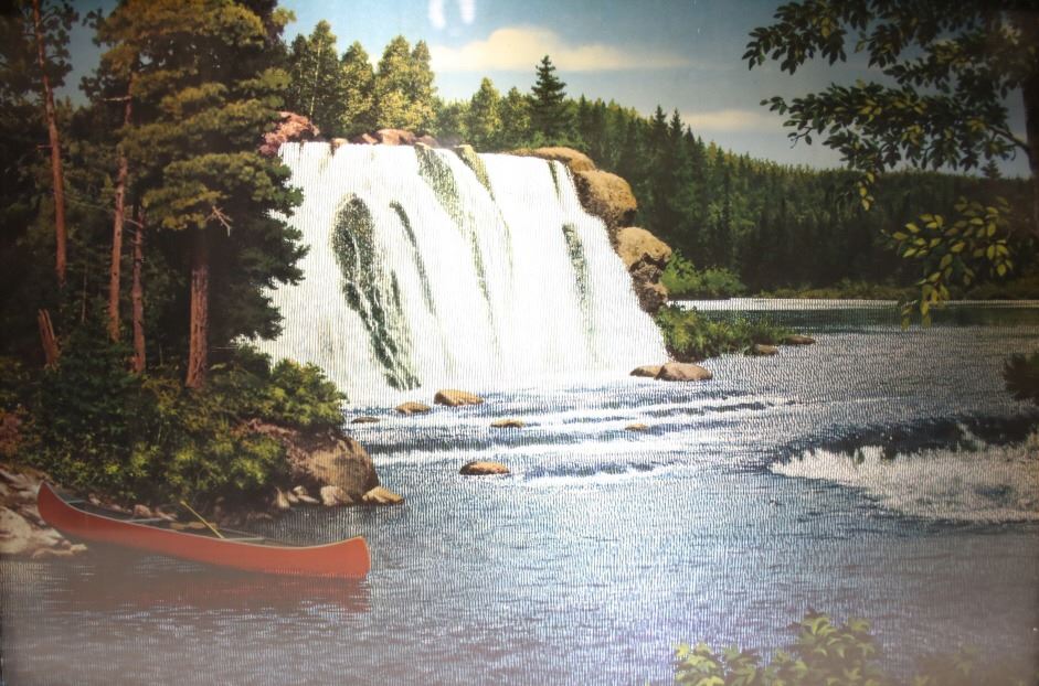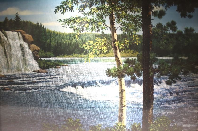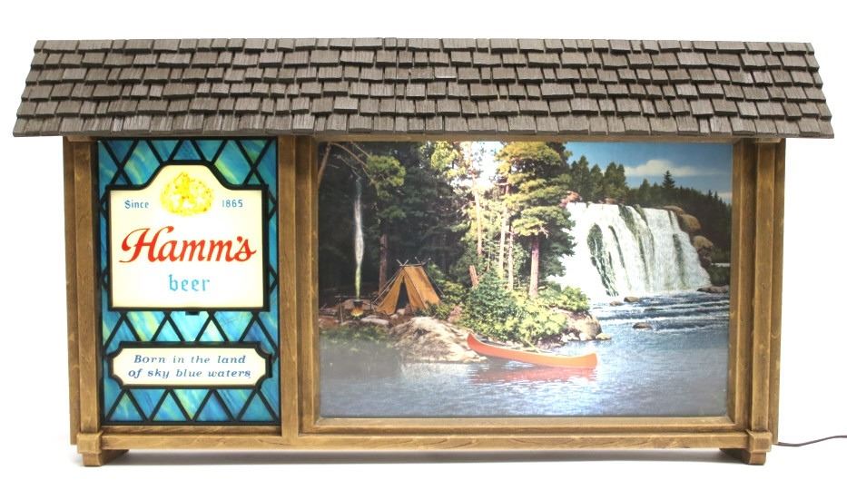 For your consideration in this lot is a desirable Hamm's Beer "Scen-O-Rama", light up advertising sign. The sign has the sought after scrolling graphics, which depict a serene lake-front camp site, which scrolls to show a flowing waterfall, and woodland area. The entirety of the sign is designed to resemble a cabin itself, with textured roof tiles, and a case which has the look of real wood, and siding. The left portion of the sign has a plastic "stained glass" window, with a beveled frame set in front. The window reads "Since 1865 - Hamm's Beer - Born in the land of sky blue waters". Additionally, the back of the case has two manufacture labels, the first reading "I.B. OF T.C.W.&H. OF A. - UNION MADE", the second reading "Designers - Manufactures - Lakeside Plastics - Minneapolis Chicago - 3526890". Theses signs were manufactured between the late 1960's through the early 1970's, this example is in very-good working condition. The plastic window panel does however show a subtle crack. The sign measures 34 1/8" wide, 19" tall, and 5" deep.