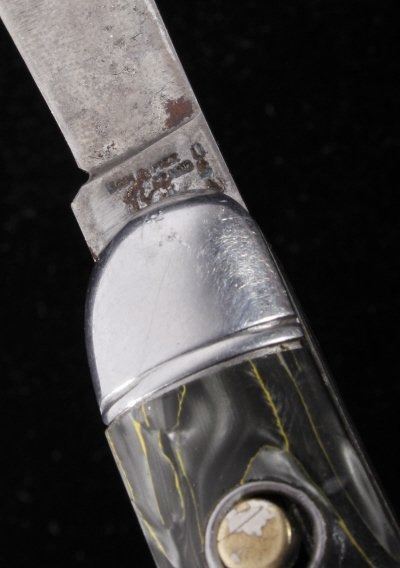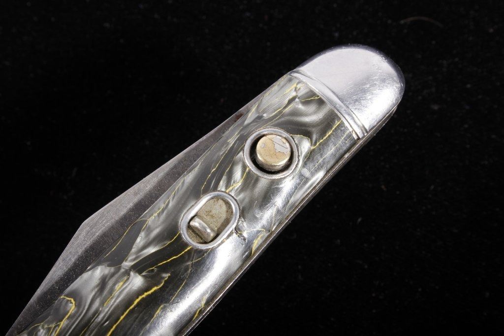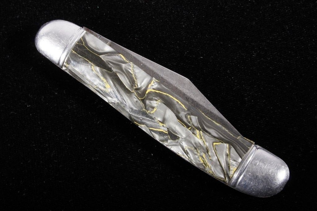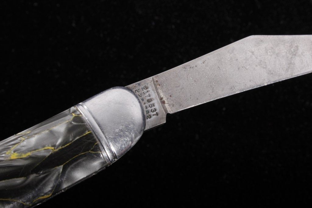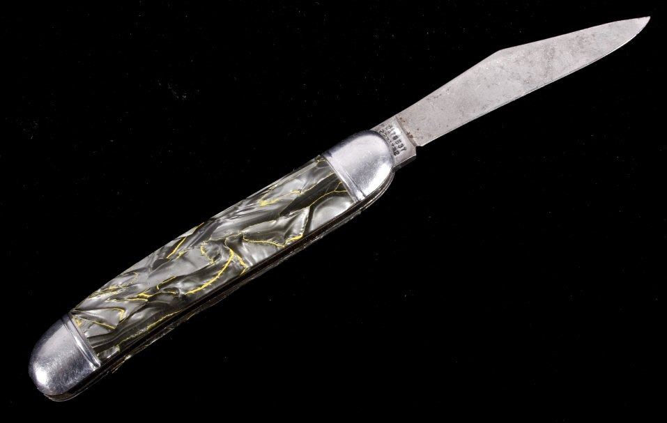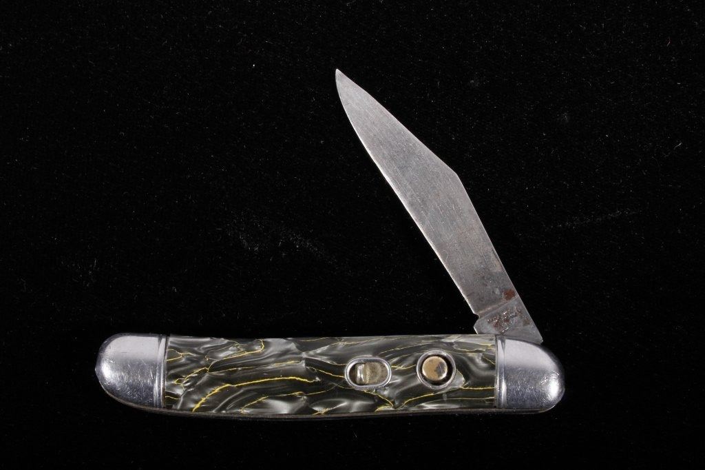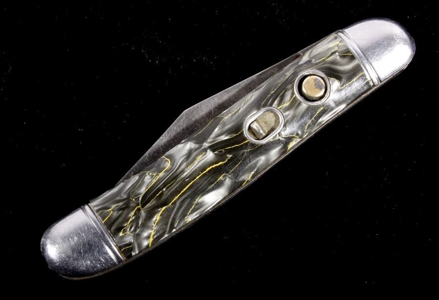 This is a rare original 1950's Hammer Brand (Imperial) switchblade (switch blade) push button knife, knick-named the "Toothpick". The piece shows the rare grey/silver/yellow marble like celluloid scales or grips. Marked Hammer Brand USA with logo and serial number on other side. Rare piece. Exceedingly rare 1940-1950's automatic knife. Measures 6 1/8"L when open and 3.5"L when closed. Has push button and lock. Works well intermittently.