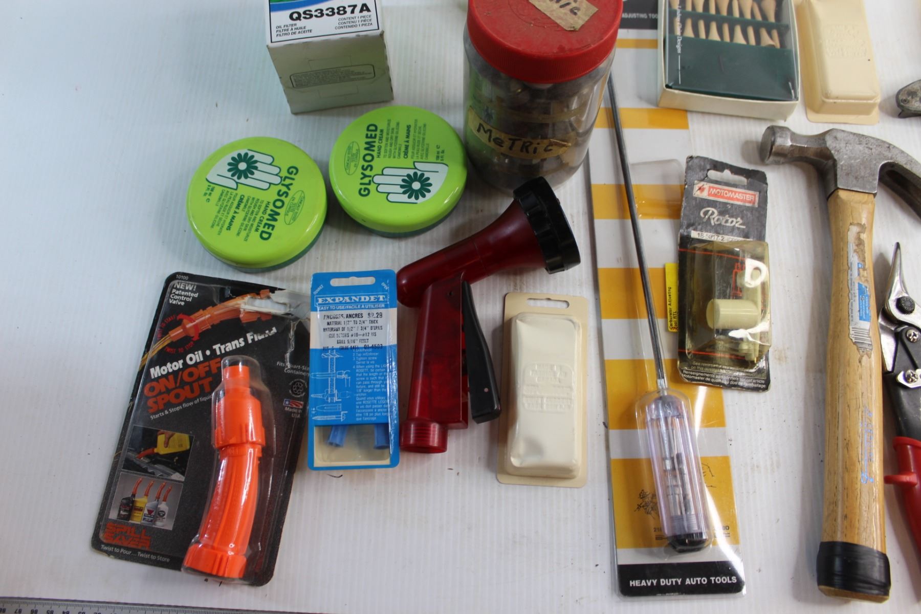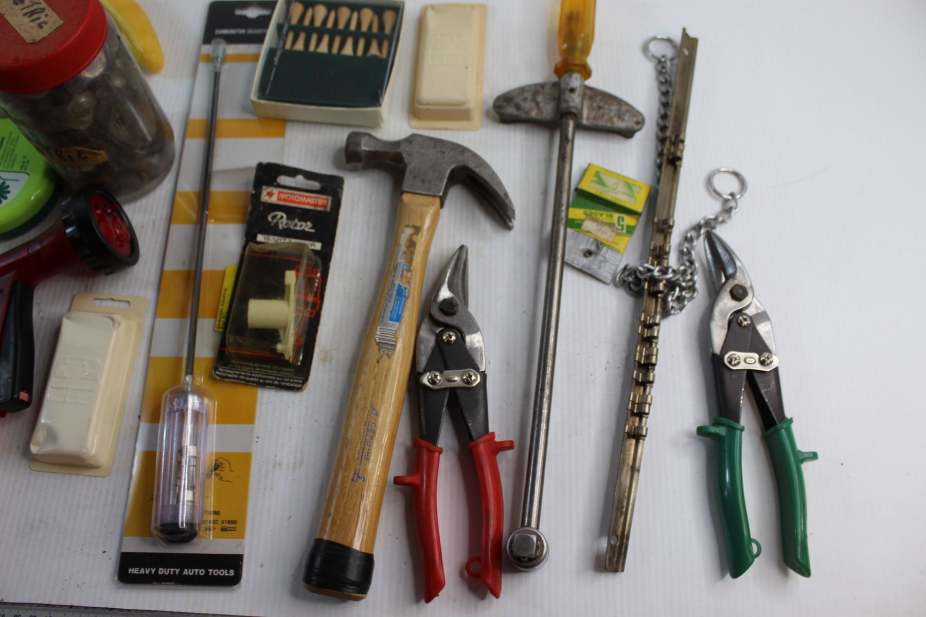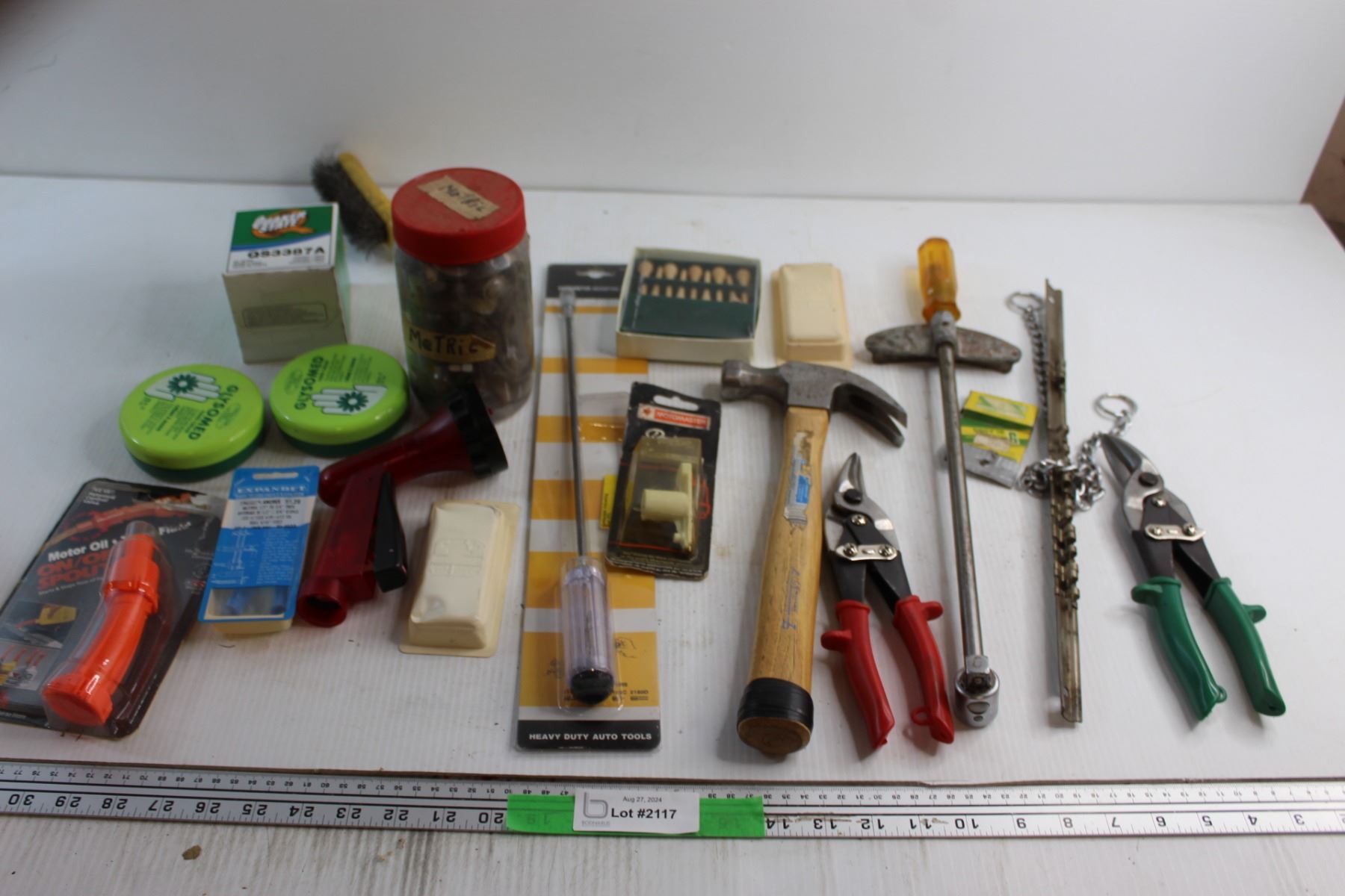 Hammer, Tin Snips, Oil Filters and Assorted Items