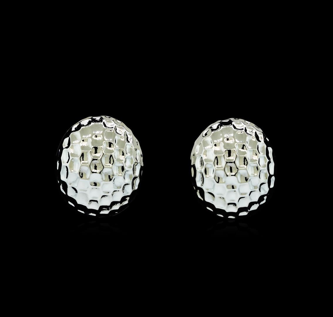 High end designer jewelry. Hammered Metal Oval Earrings - Rhodium Plated. Rhodium Plated French Clip. Silver. 1inches.