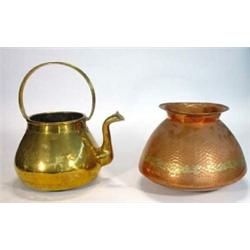 Hammered copper pot with flared rim and a brass watering can on looped handled, largest 38cm high…