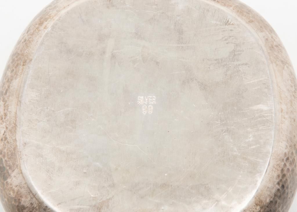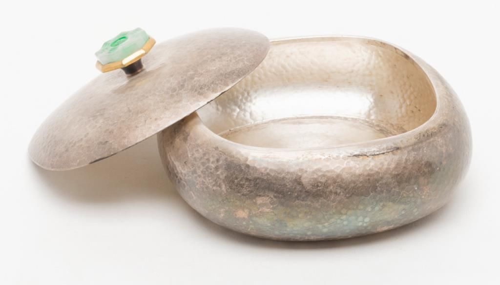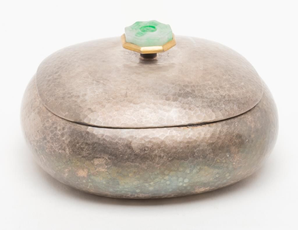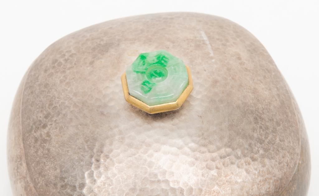 Hammered sterling silver box with carved jade top circa 1920s to 1960s and of oriental origin probably Hong Kong. The bottom is stamped, “silver 99”. Weighs 17 ½ oz. Est.: $300-$600