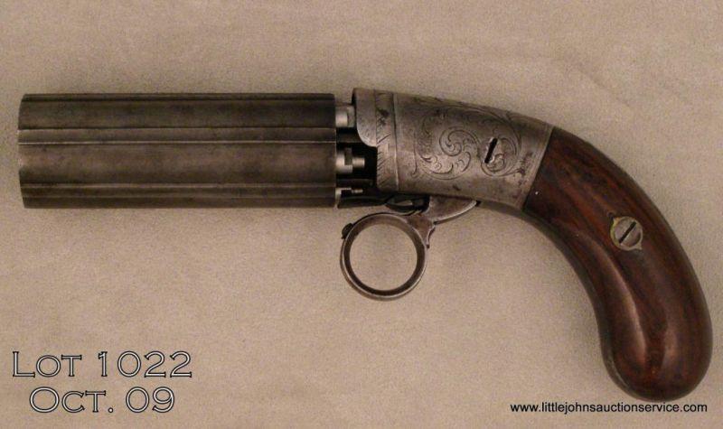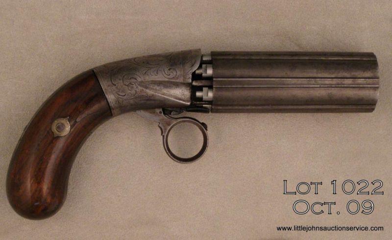 Hammerless ring trigger 6 shot pepperbox, .32 cal., standard size, 3.25” barrels with fluted ribs, engraved frame, with bag shaped handle. Good condition overall with nice patina, pin prick pitting on the barrels and frame, and the head of the trigger screw has been slightly damaged. Grips are good showing a small chip where the grip screw ferrule is. Est. $350-$700.