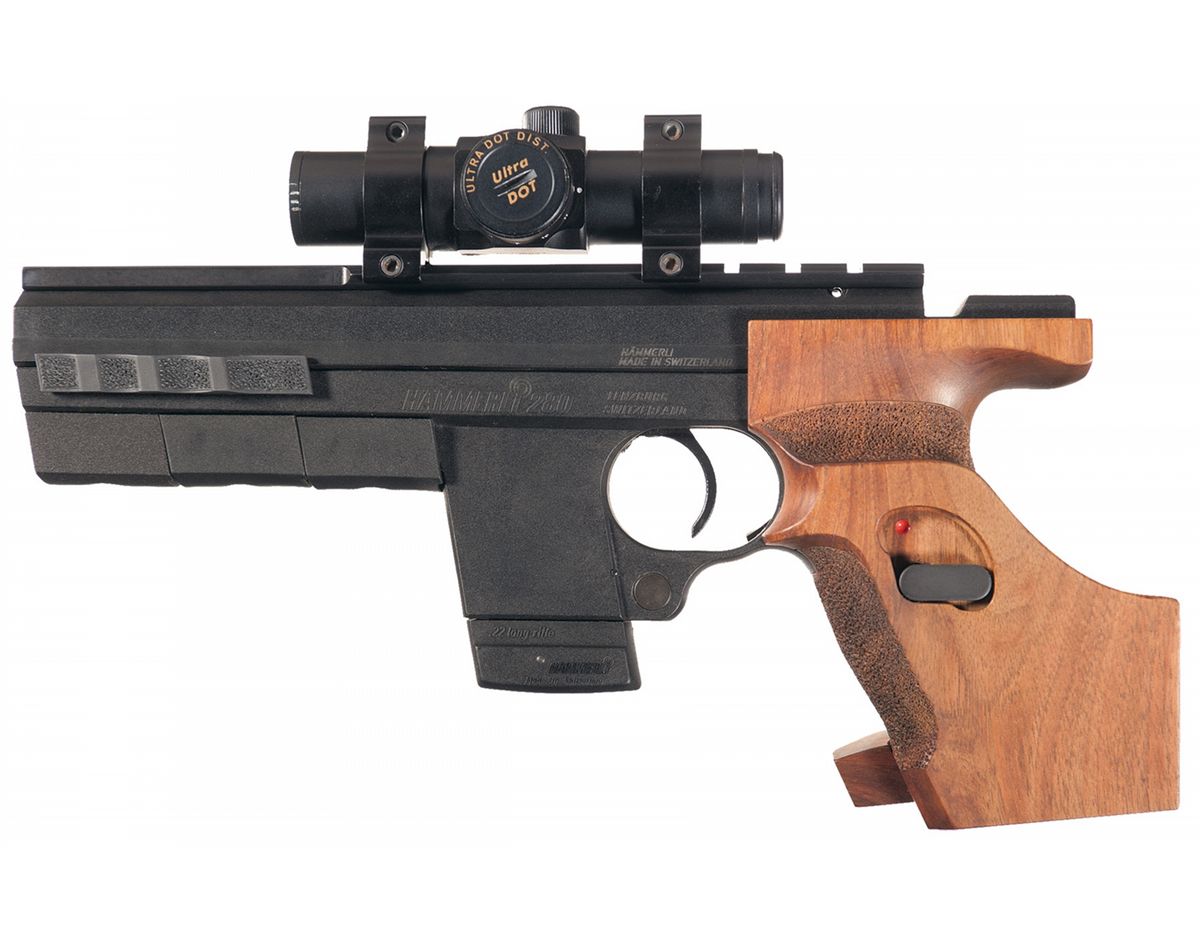 This pistol has a scope rail marked "Knappent." with an Ultra Dot red dot scope. Fitted with textured wraparound walnut grip with adjustable palm shelf. The safety is interesting in that it is recessed in the left side of the grip.There is one weight and two plastic weight look-a-likes attached under the barrel. With box numbered to gun, instructionst, magazine loading tool, 1 extra magazine, roll up tool pouch with tools, two extra weights, 1 plastic weight look-a-like, front sight and adjustable rear sight.