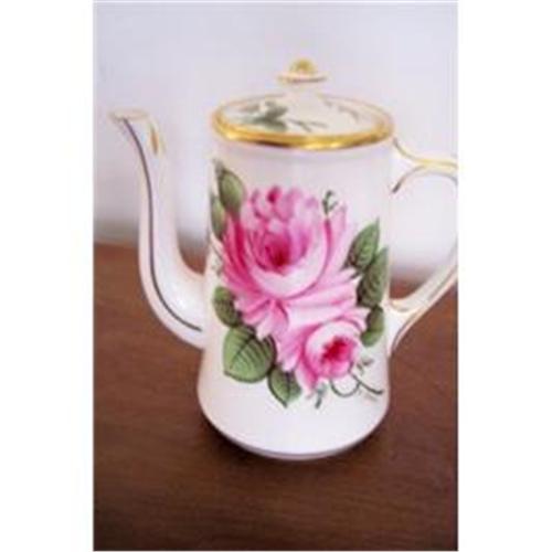 This hot water pot is typical of the quality craftsmanship and handpainted artistry that characterized Hammersley china for years. It stands 6.5 inches high, and is decorated with big, bright, handpainted pink roses and deep green leaves. It is in impeccable condition, and signed by the artist. Makes a great coffee pot for one or two people!