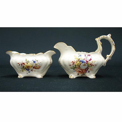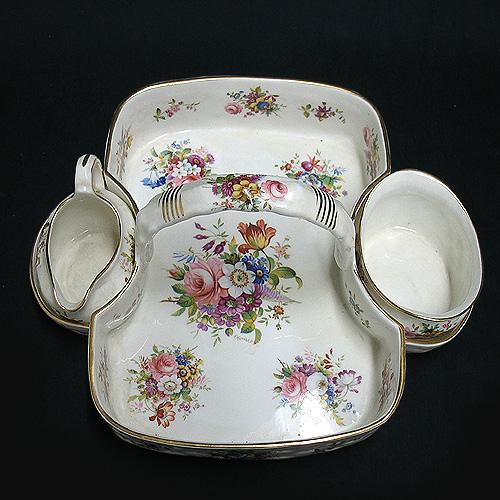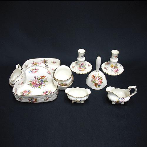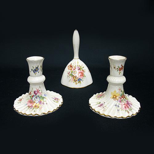 Hammersley bone china dessert set including pair of 4" candle holders; basket with fitted creamer and sugar (basket measures 4" high x 10" x 7"); additional creamer and sugar; and 6" bell; all with polychrome floral design on white ground, mid 20th C. (no visible defects)