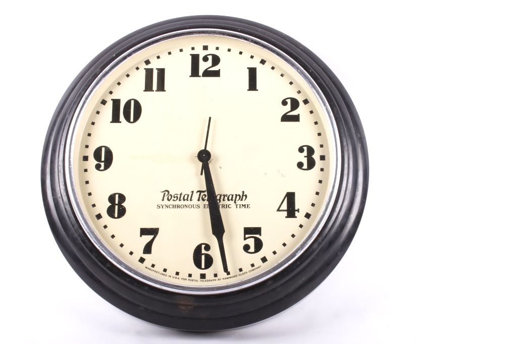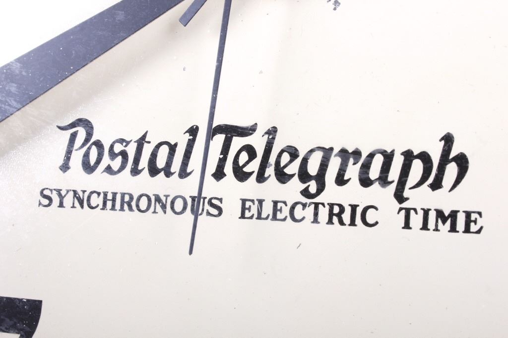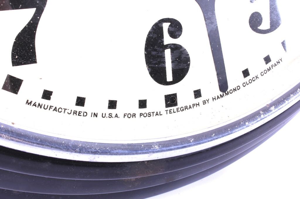 This is a Hammond Postal Telegraph wall clock from the early to mid 1900's. The clock face reads "Postal Telegraph Synchronous Electric Time". The bottom of the face is marked "Manufactured in U.S.A. for Postal Telegraph by Hammond Clock Company". The clock shows good overall condition. The original electric movement has been replaced with a battery operated movement. The piece measures 19.75" in diameter.