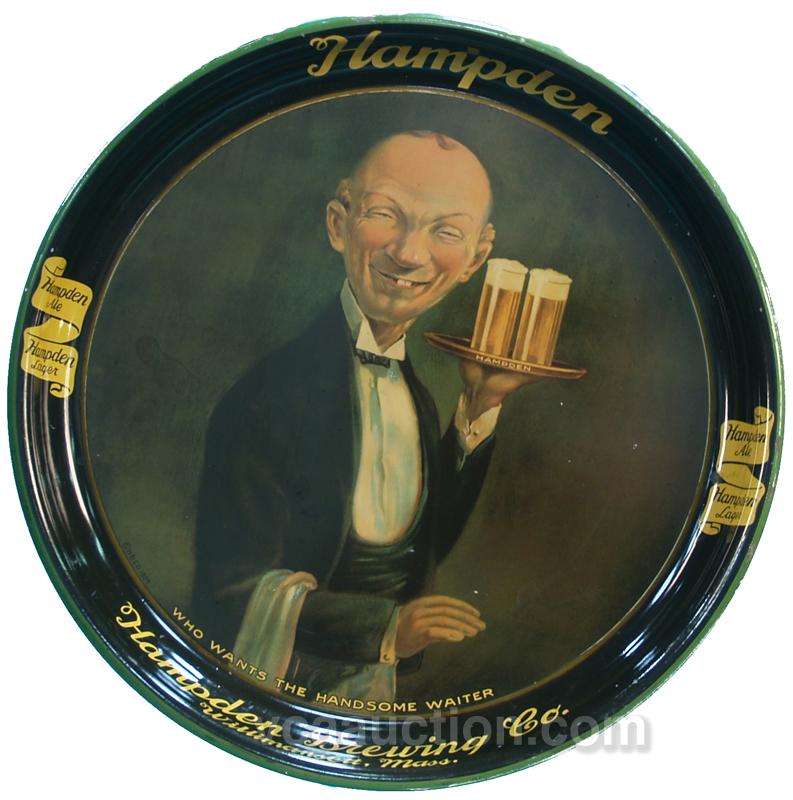 Hampden Brewing Co. Willimansett, Mass. Round Tin Serving Tray, "Who Wants The Handsome Waiter" c1934 - 13" diam