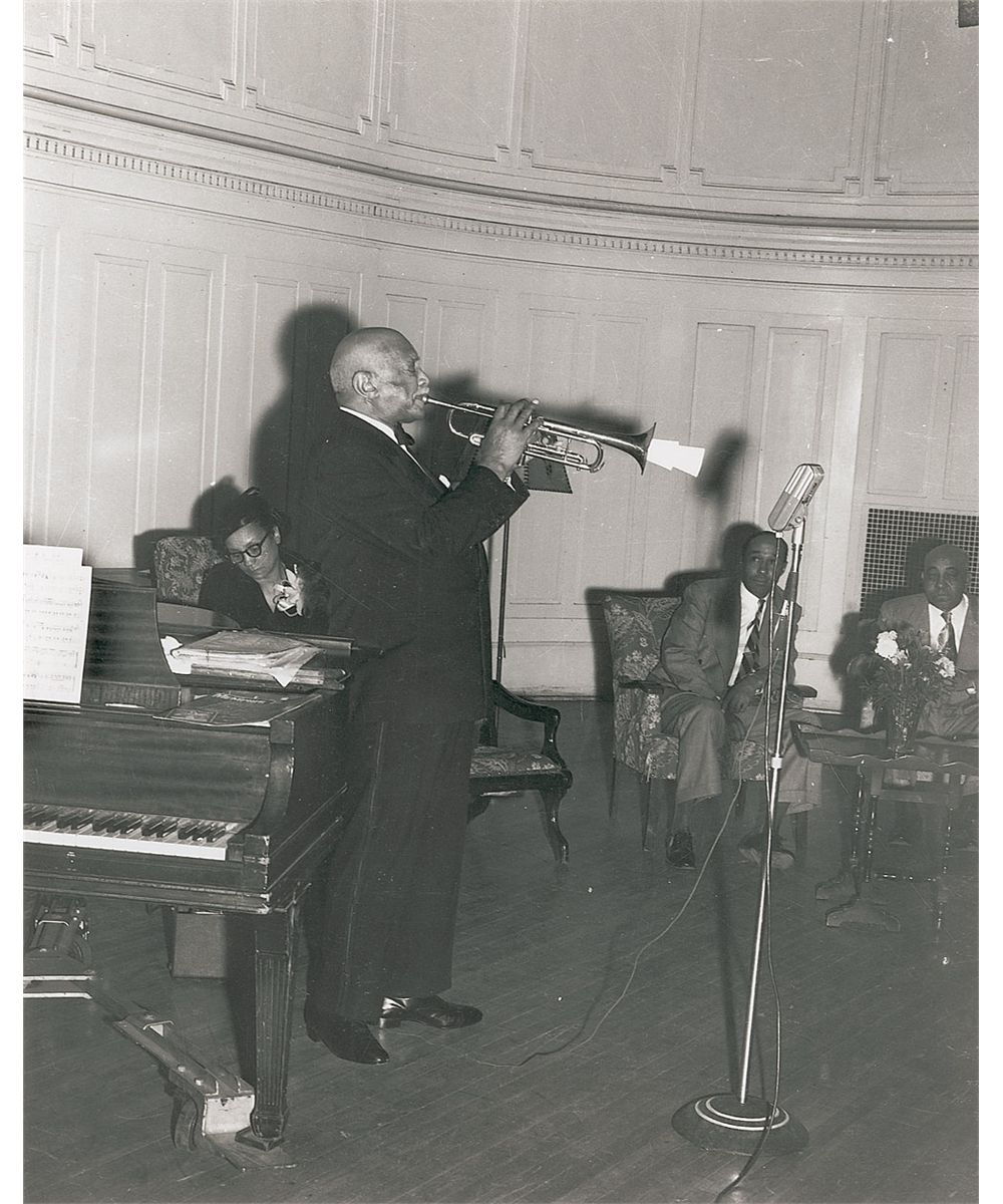 Three second generation glossy and satin-finish photos, originally taken by Teenie Harris, two 10 x 8 and one 8 x 10. One photo is of Lionel Hampton and Bennie Goodman sharing a laugh; a great photo of Vernon Green playing his sax while walking down a bar; and one of W.C. Handy performing. In fine condition. Harris was an accomplished African-American photographer who chronicled life in the black neighborhoods of the city for the Pittsburgh Courier. His work was rarely seen outside of Pittsburgh, until after his death in 1998.
