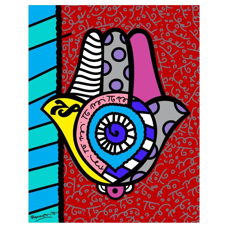 "Hamsa Red Up" is an open edition giclee on canvas by Romero Britto. The piece comes hand signed by the artist and is authenticated en verso with the official Britto stamp. Measures approximately: 14" x 11".