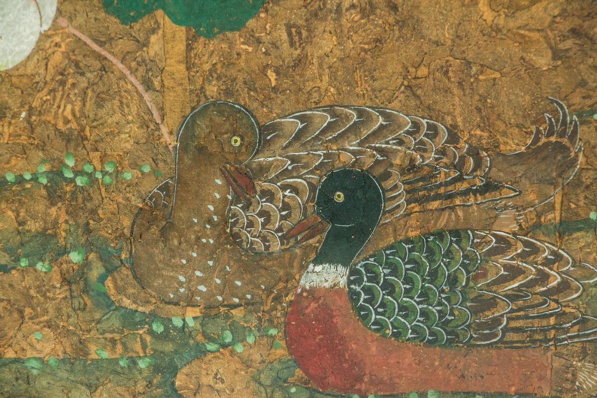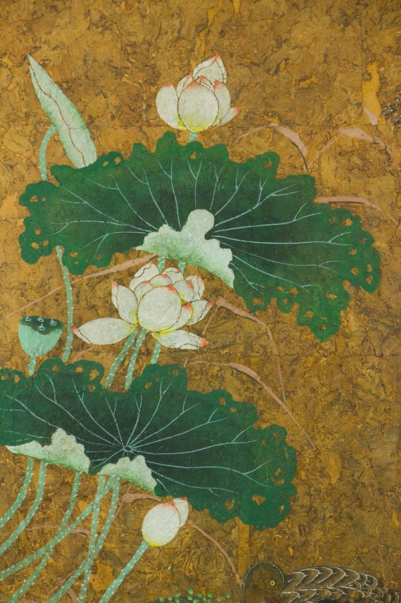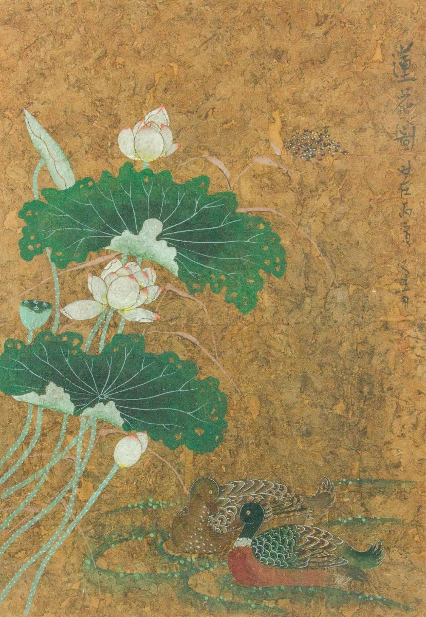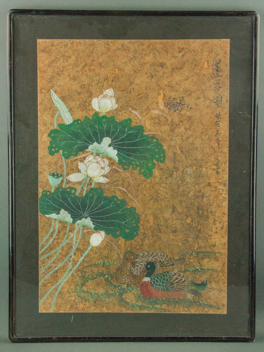A pair of mandarin ducks swimming on lotus pond; Chinese ink and watercolour on board; with frame; signed Han Qing and inscribed with one artist seal; 69 cm × 47 cm