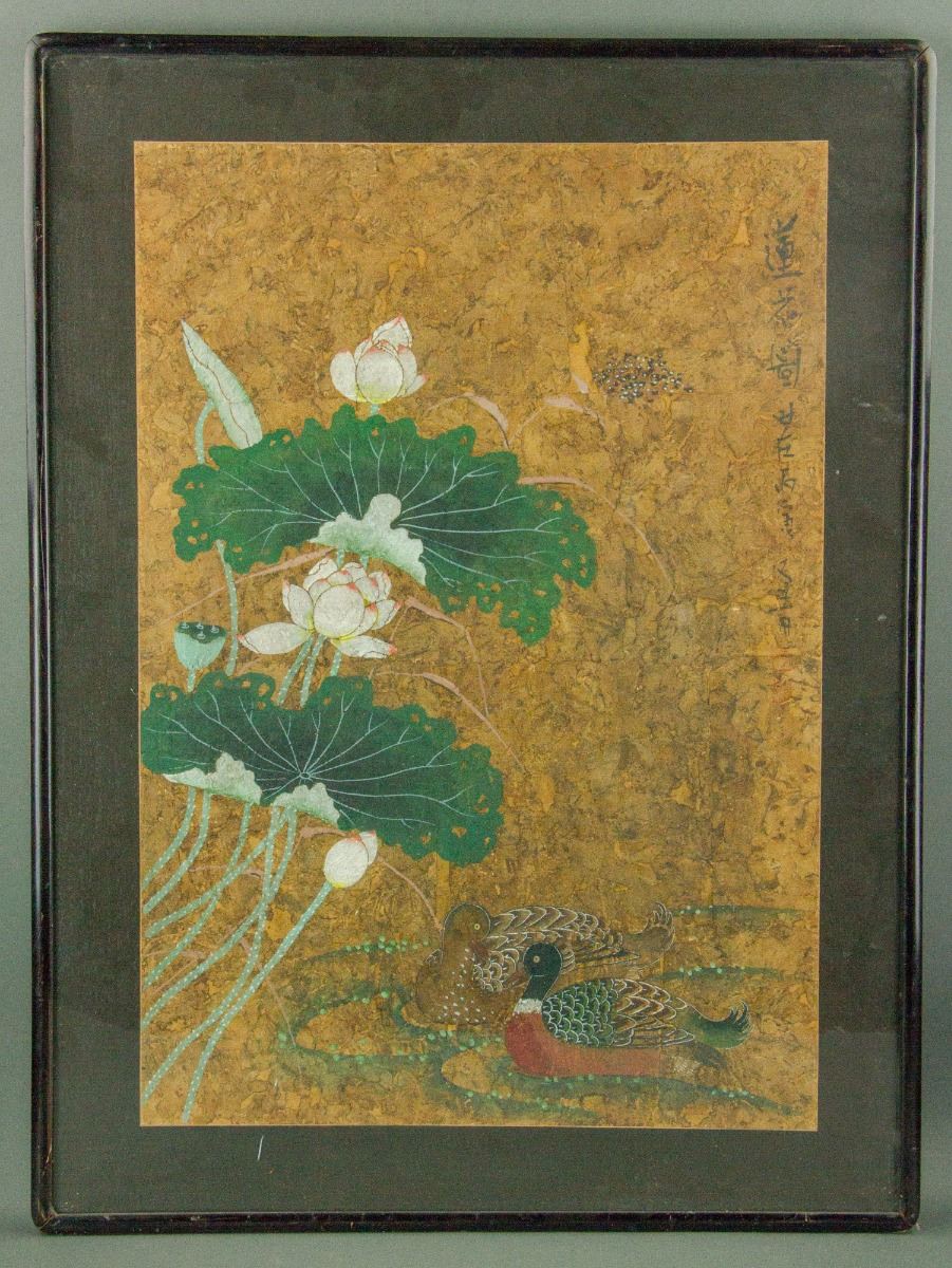 A pair of mandarin ducks swimming on lotus pond; Chinese ink and watercolour on board; with frame; signed Han Qing and inscribed with one artist seal; 69 cm × 47 cm