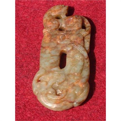 1st. century CE green jade carving in shape of a chilong on an elongated bi disk. A hydra is located on the distal part of the disk. C scrolls decorate the reverse side of the disk. The space below the chilong's head appears as a central perforation for suspension as a pendant. This is a high quality of jade carving of Han period, done in green jade in high relief with great details. Length: 3.1" (8 cm.). Provenance: Dr. Veleanu's jade collection, the author of the collectors' book: "Jade, 5000 BC to 1912 AD, Guide to collectors". Estimated retail value: $2800.