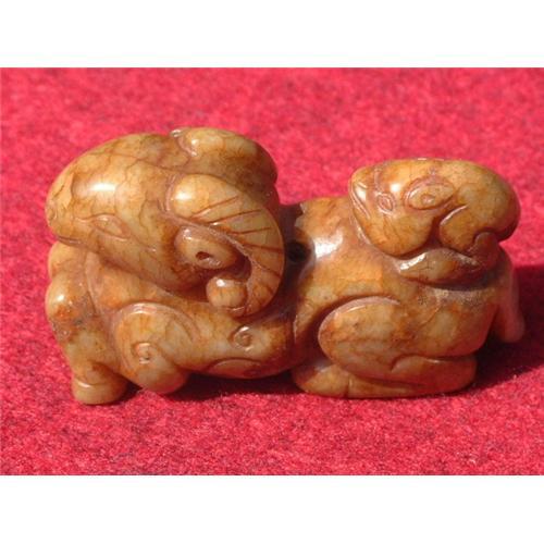 1st. century BCE green jade carving in shape of a mutton with offspring on its back. This is a high quality of jade carving of Han period, done in green jade with great details. Length: 2.5" (6.5 cm.). Provenance: Dr. Veleanu's jade collection, the author of the collectors' book: "Jade, 5000 BC to 1912 AD, Guide to collectors". Estimated retail value: $1100.