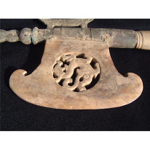Western Han period halberd end with yellowish-cream jade hatchet decorated with a lion. Size: 11" X 6.5" (28 X 16.5 cm.). Estimated value: $5000.