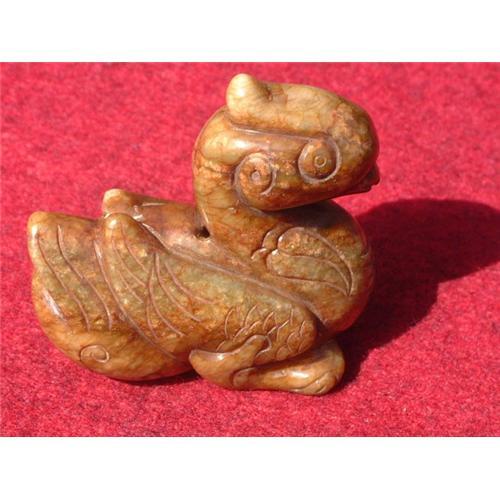 1st. century BCE yellowish-green jade carving in shape of a bird. The body of the bird is decorated with c-scrolls. This is a high quality of jade carving of Han period, done in yellowish-green jade in high relief with great details. Length: 2.5" (6.5 cm.). Provenance: Dr. Veleanu's jade collection, the author of the collectors' textbook: "Jade, 5000 BC to 1912 AD, Guide to collectors". Estimated retail value: $1300.