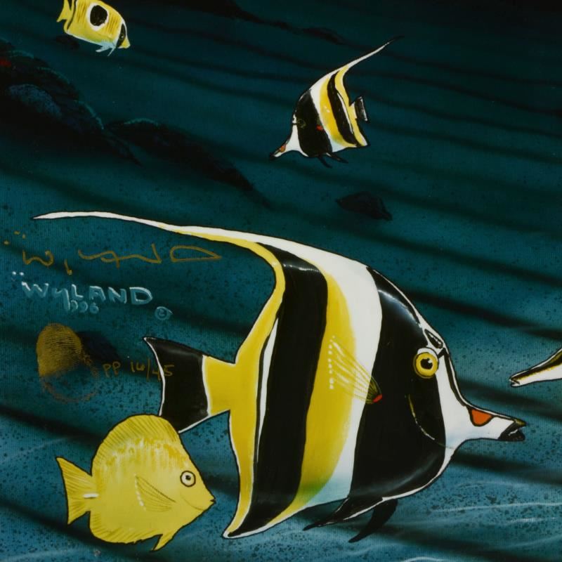 Hanalei Bay by Wyland. "Hanalei Bay" is a limited edition cibachrome, PP numbered and hand signed by Wyland. Includes Certificate of Authenticity and measures approximately 22" x 30" (image). Due to the nature of these pieces there may be some imperfections along the edges that would be concealed when framed and due to the glossy surface there may be some smudging in the signature and number area.