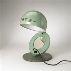 Hanau makeup mirror Hanau Germany, 1930s enameled metal, steel 10"dia x 11"h Paper label and impressed factory marks.