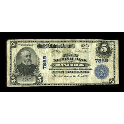 <B>Hancock, MD</B></I> - $5 1902 Plain Back Fr. 599 <B>The First NB</B></I> Ch. # 7859<BR>An extremely rare western Maryland note, with the census showing just four large examples, with this one of those four. All have been closely held for many years, with our records showing only Series 1929 offerings from here at public sale for at least the past decade. <B>Fine,</B></I> with the bottom margin trimmed very slightly into the design on the right end.<BR><BR><b>Shipping:</b> Coins & Currency (<a target="_blank" href="http://www.heritageauctions.com/common/shipping.php">view shipping information</a>)