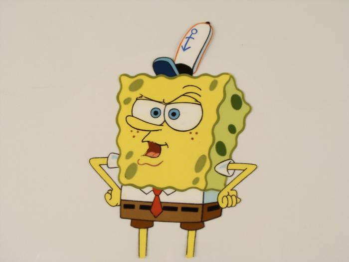 This original animation cel is from the Nickelodeon TV show SpongeBob Squarepants. The story takes place under the deep blue sea in Bikini Bottom, where SpongeBob resides. SpongeBob, who is a yellow, porous sponge, is your typical happy-go-lucky character, as he is always cheerful and enjoys making people laugh. Patrick Star, SpongeBob's neighbor who is a starfish, is your average children's show idiot, as he boasts knowing nothing and is often getting himself into ridiculous situations. Between the homes of these two lies the home of the miserable Squidward, a squid, who is known for being grouchy and playing tricks on SpongeBob and Patrick. Both SpongeBob and Squidward work at the Krusty Krab, a fast food business run by the greedy money-loving Mr. Krabs, a crab, the arch rival of the evil, possibly misunderstood, Plankton. Another neighbor, Sandy Cheeks, an athletic squirrel who normally wears an astronaut's space suit, was introduced in "Tea at the Treedome." She spends most of her time inventing and experimenting. SpongeBob has his hands at his hips.Original Production Animated Cel Overall Size of Cel: 10 1/2" x 12 1/2" Very Good ConditionThis is an original hand-painted cel set-up used in the production of an episode of "SpongeBob SquarePants." Each one-of-a-kind set-up represents a slight change in position of the characters. When individually photographed and projected in rapid succession, the images appear to move.