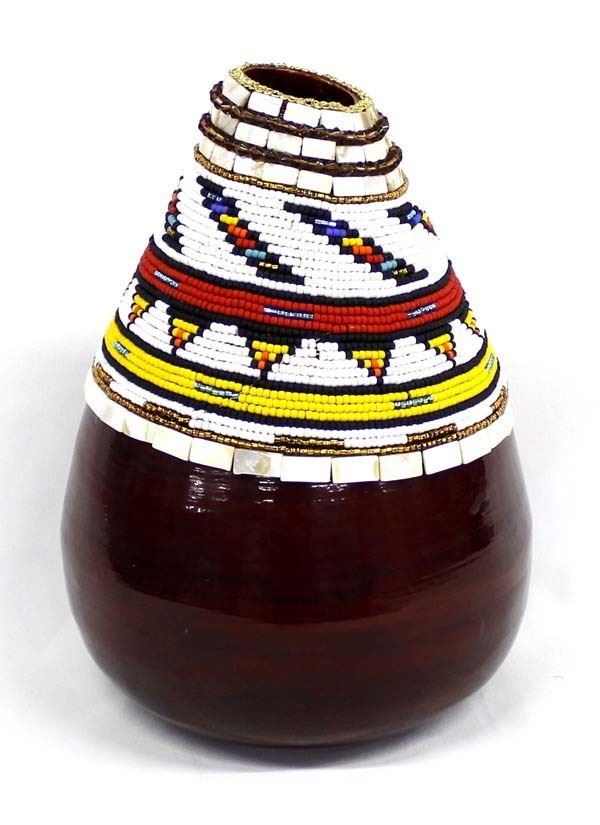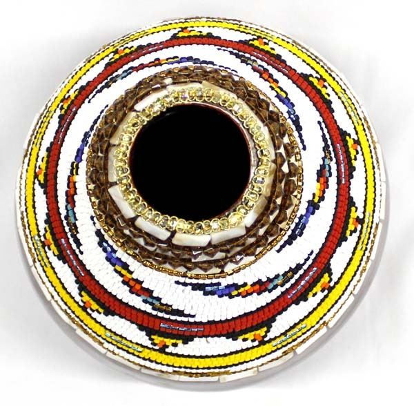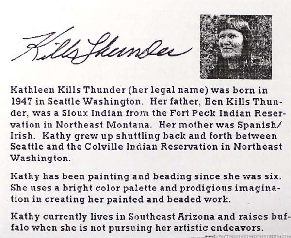 Hand Beaded Bamboo Vase by Kills Thunder, measures 8'' x 12'', beautifully beaded in bright colors, mother of pearl and faceted bead accents, Artist Bio: Kathleen Kills Thunder (her legal name) was born in 1947 in Seattle, WA. Her father, Ben Kills Thunder, was a Sioux Indian from the Fort Peck Indian Reservation in NE Montana and her mother was Spanish/Irish. Kathy has been painting and beading since she was six.