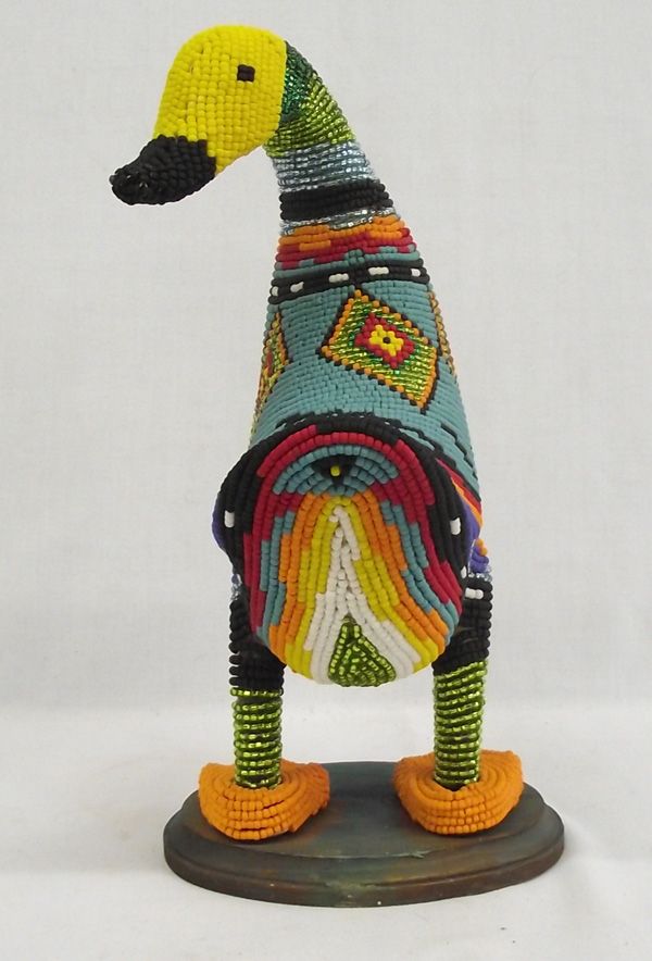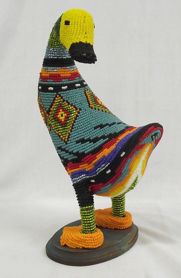Hand Beaded Duck Statue - Kills Thunder. Another marvelous hand beaded animal. Arizona artist, Kills Thunder uses colorful beads and creates southwestern designs on everything from animal figures to hair barretts. This charming duck measures 13.75''H x 8.5''W.
