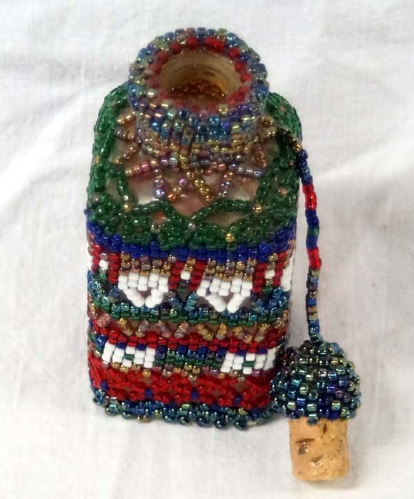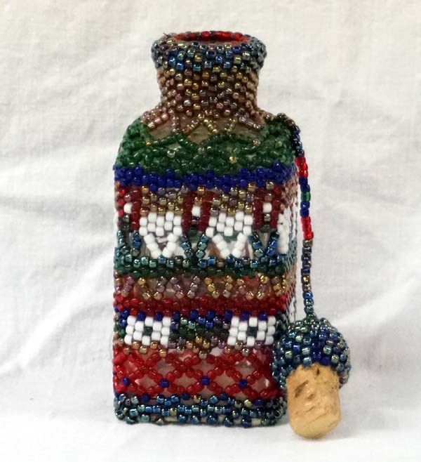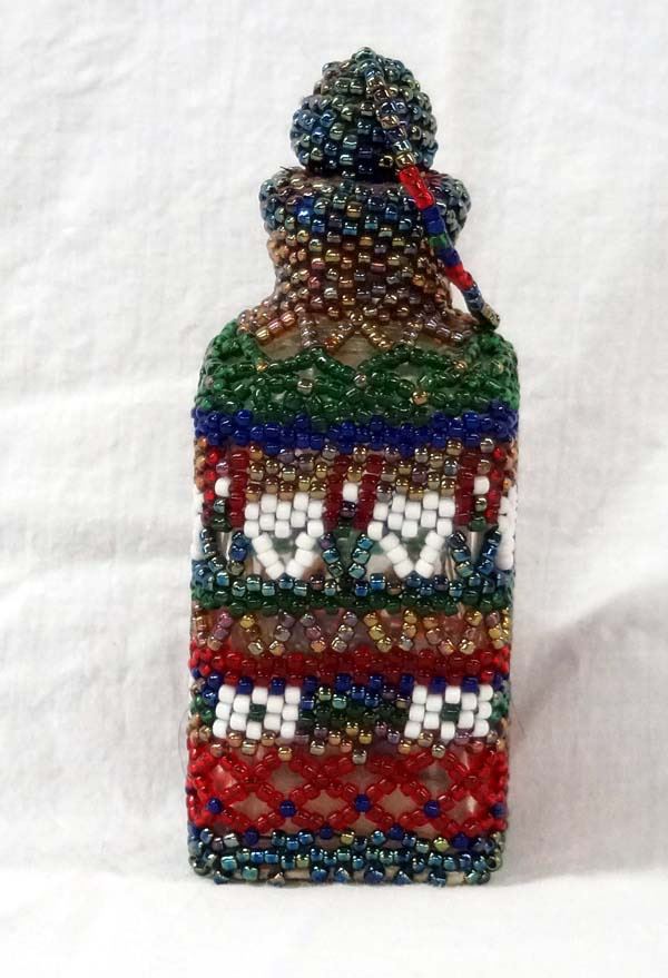 From the Whittredge Estate, we have an Older Hand Beaded Glass Bottle by Kathy Kills Thunder, measures 5.5''H x 2''W x 2''Deep, Artist Bio: Kathleen Kills Thunder (her legal name) was born in 1947 in Seattle, WA. Her father, Ben Kills Thunder, was a Sioux Indian from the Fort Peck Indian Reservation in NE Montana. Her mother was Spanish/Irish. Kathy grew up shuttling back and forth between Seattle and the Colville Indian Reservation in NE Washington. Kathy has been painting and beading since she was six. She uses a bright color palette and prodigious imagination in creating her painted and beaded work. Kathy currently lives in SE Arizona and raises buffalo when she is not pursuing her artistic endeavors.