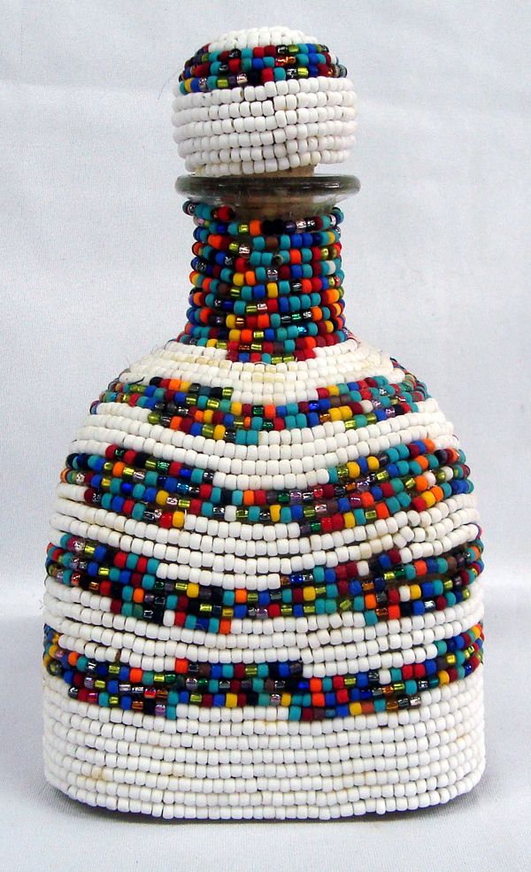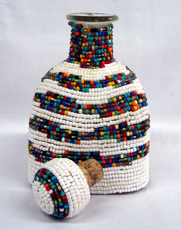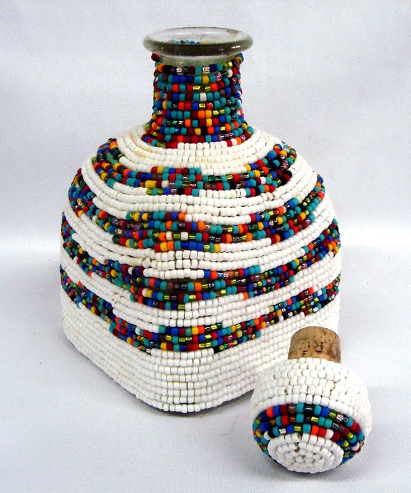 Hand Beaded Glass Decanter - Kills Thunder. Beautiful beading, done by Arizona artist, Kills Thunder. Measures 8''H x 4.25'' x 4.25''. Glass and cork stopper.