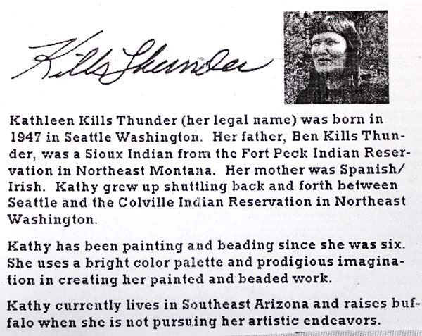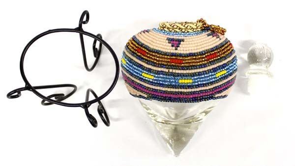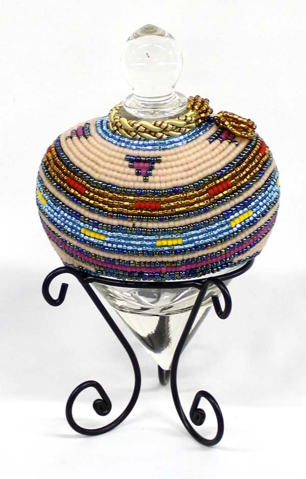 Hand Beaded Glass Decanter on Metal Stand by Kathy Kills Thunder, measures 5.5'' x 10'' x 4'', beautifully beaded in iridescent colors, Artist Bio: Kathleen Kills Thunder (her legal name) was born in 1947 in Seattle, WA. Her father, Ben Kills Thunder, was a Sioux Indian from the Fort Peck Indian Reservation in NE Montana and her mother was Spanish/Irish. Kathy has been painting and beading since she was six.