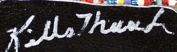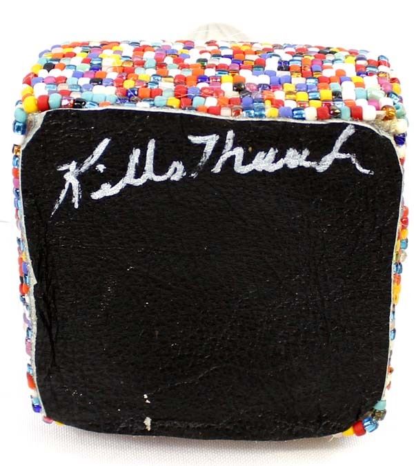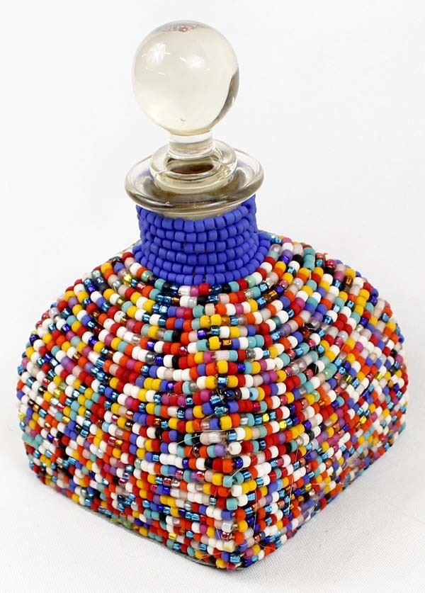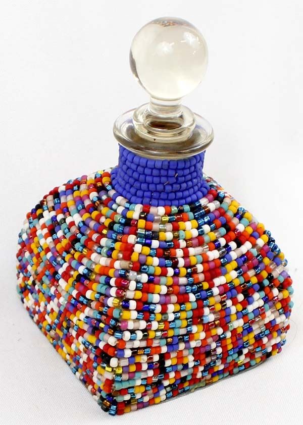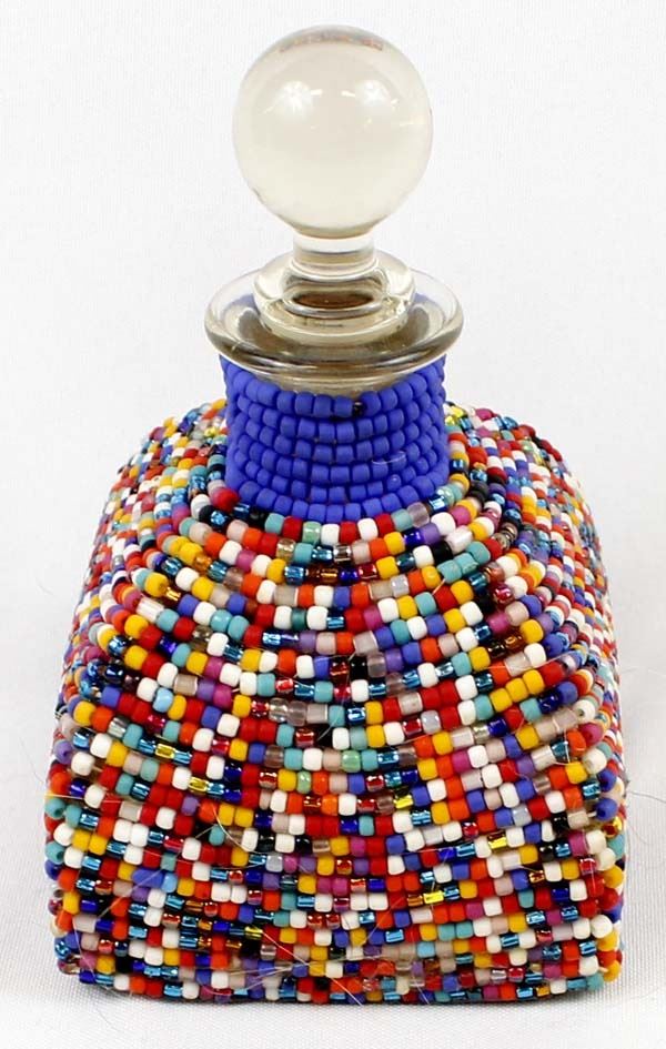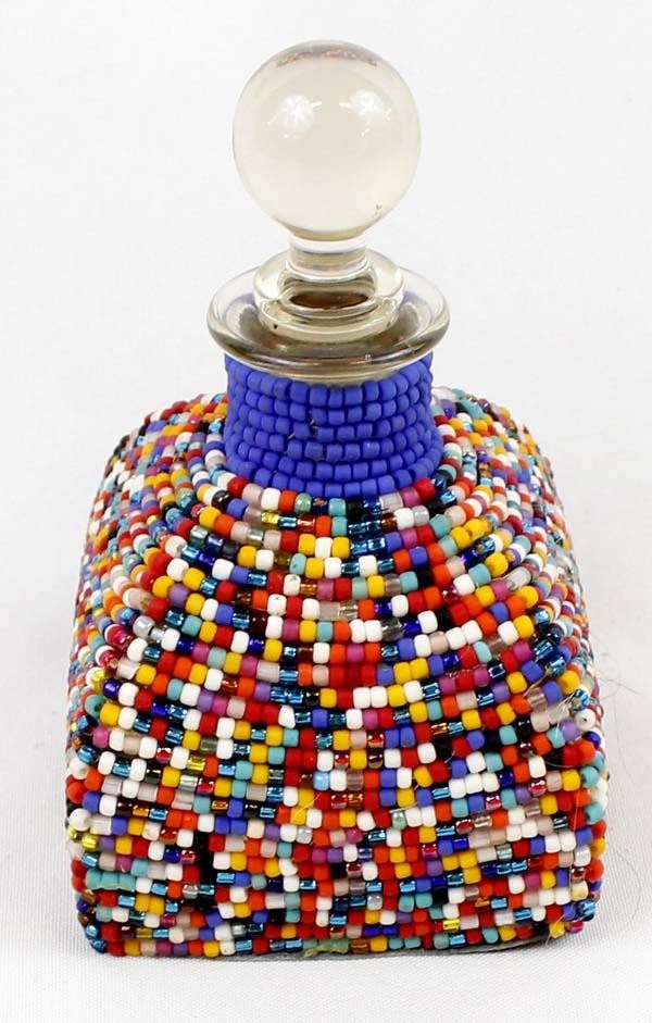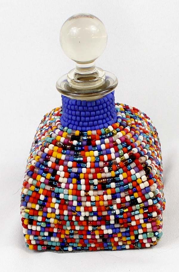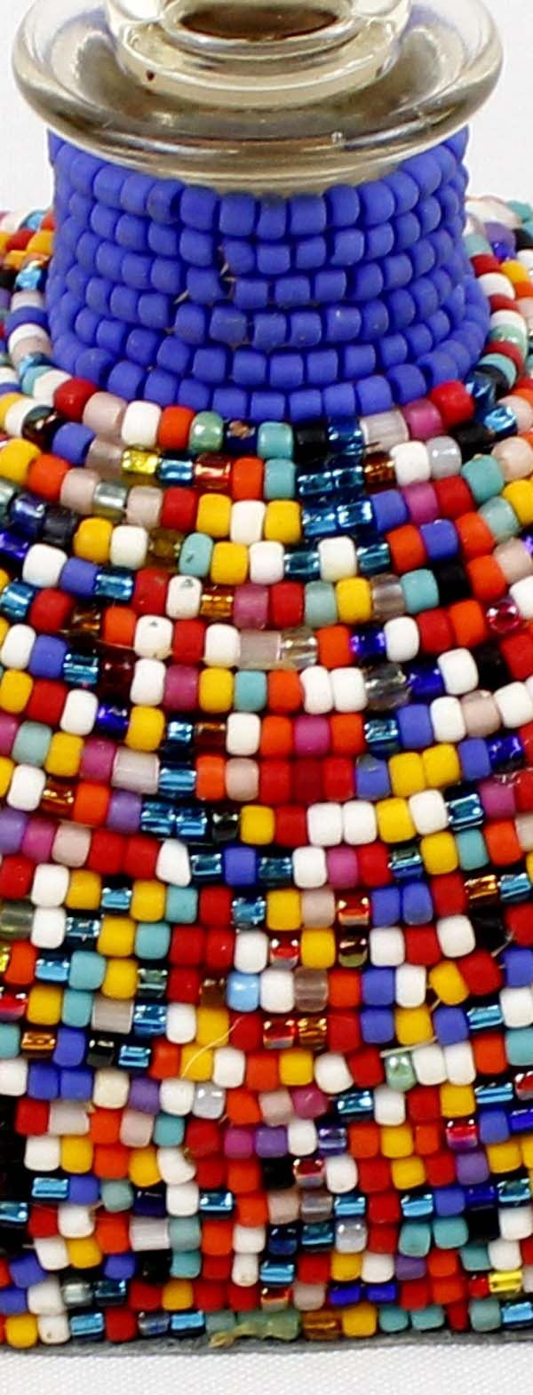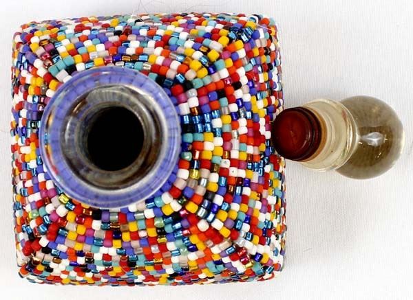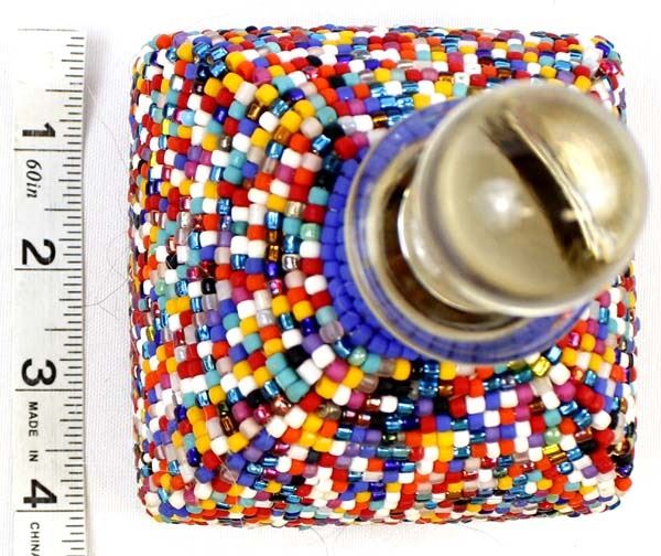 Hand Beaded Glass Decanter by Kills Thunder, measures 6" x 3.5" x 3.5"