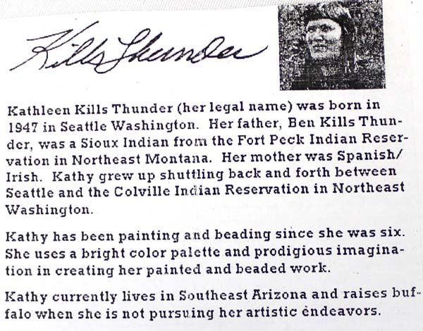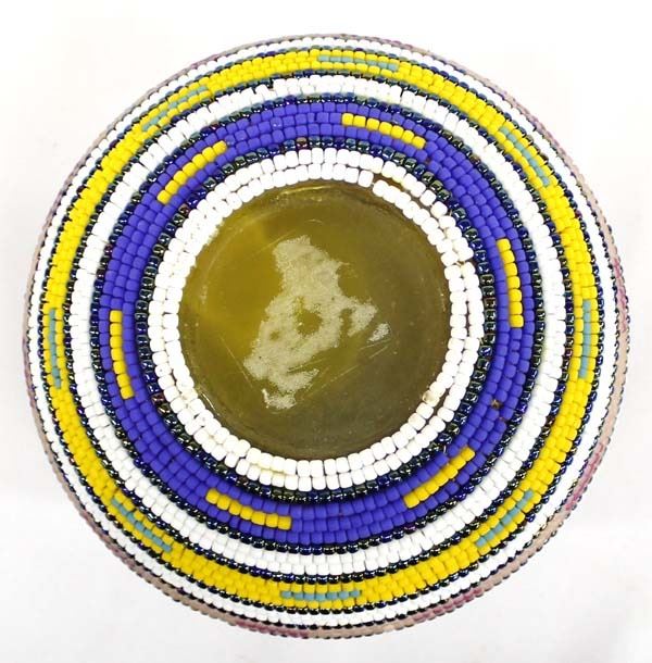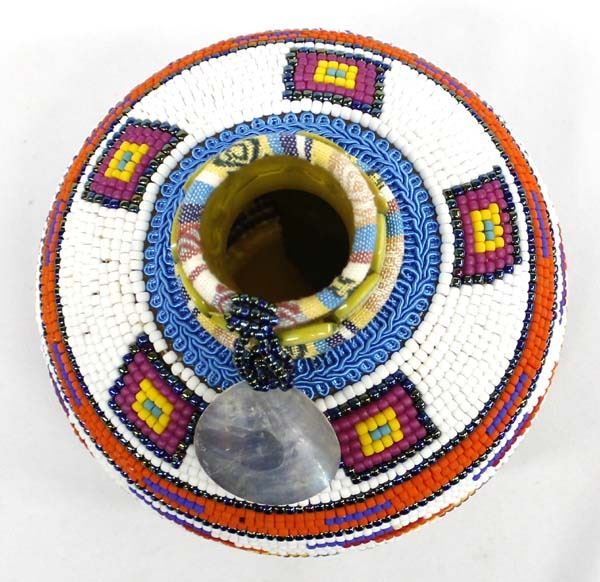Hand Beaded Glass Vase by Kathy Kills Thunder, measures 6.5'' x 7'', embellished with bead and shell dangle, embellished with rolled cloth coils and green beads, Artist Bio: Kathleen Kills Thunder (her legal name) was born in 1947 in Seattle, WA. Her father, Ben Kills Thunder, was a Sioux Indian from the Fort Peck Indian Reservation in NE Montana and her mother was Spanish/Irish. Kathy has been painting and beading since she was six.