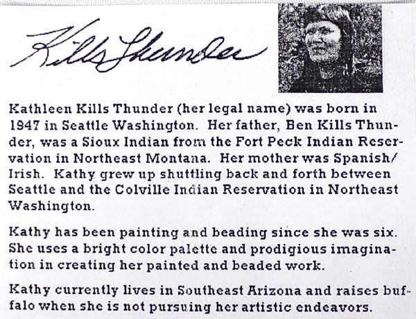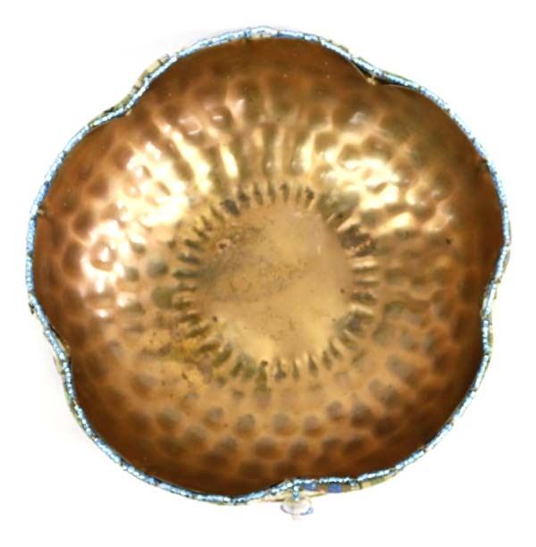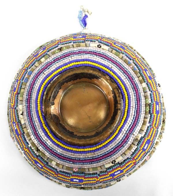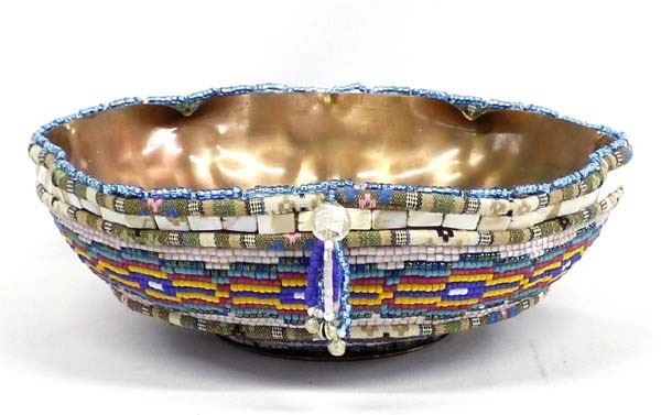 Hand Beaded Hammered Copper Bowl by Kills Thunder, measures 3''H x 10''D, she has incorporated beadwork along with colorful cloth rope, Artist Bio: Kathleen Kills Thunder (her legal name) was born in 1947 in Seattle, WA. Her father, Ben Kills Thunder, was a Sioux Indian from the Fort Peck Indian Reservation in NE Montana and her mother was Spanish/Irish. Kathy has been painting and beading since she was six.