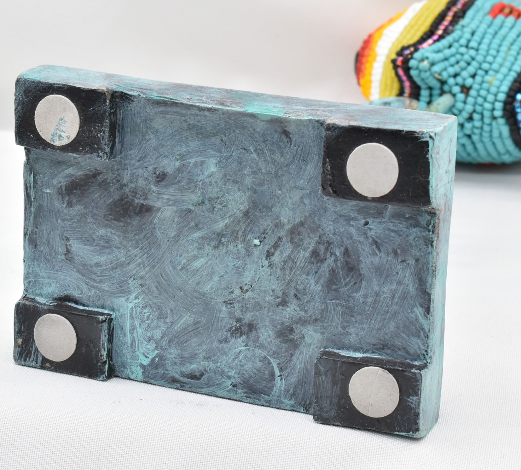 Hand Beaded Metal Fish Finial Decor by Kathy Kills Thunder, measures 13'' x 5'' x 3'', Artist Bio: Kathleen Kills Thunder (her legal name) was born in 1947 in Seattle, WA. Her father, Ben Kills Thunder, was a Sioux Indian from the Fort Peck Indian Reservation in NE Montana and her mother was Spanish/Irish. Kathy has been painting and beading since she was six.
