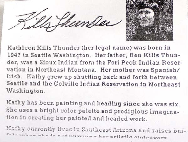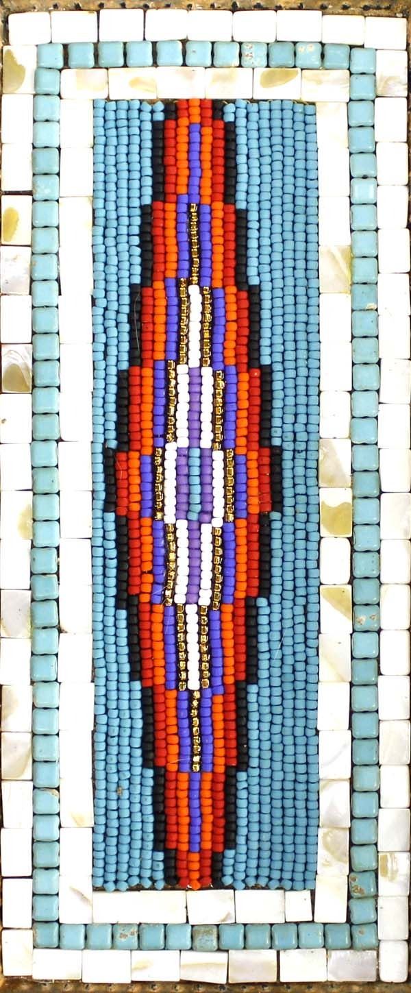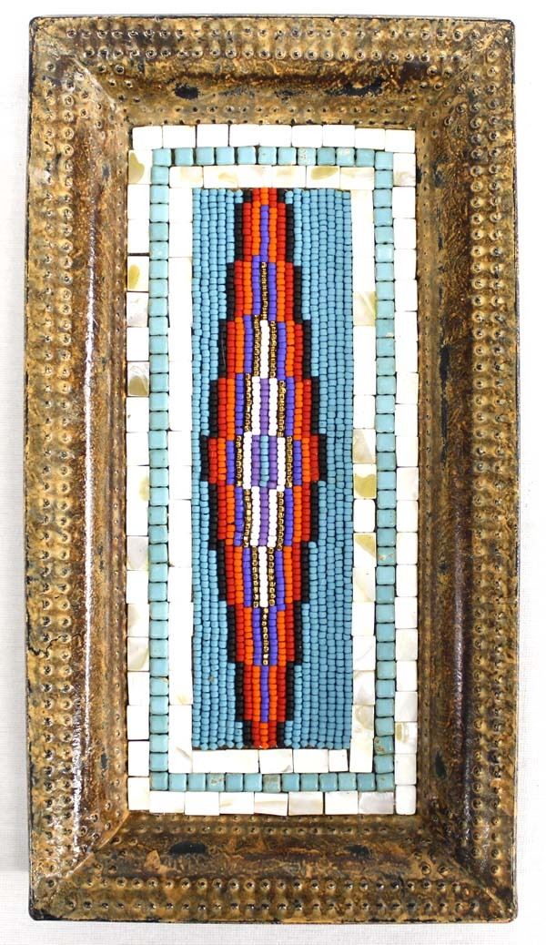 Hand Beaded Metal Tray by Kathy Kills Thunder, measures 8.5'' x 15'' x 1.5'', beautiful vibrant colors, Artist Bio: Kathleen Kills Thunder (her legal name) was born in 1947 in Seattle, WA. Her father, Ben Kills Thunder, was a Sioux Indian from the Fort Peck Indian Reservation in NE Montana and her mother was Spanish/Irish. Kathy has been painting and beading since she was six.