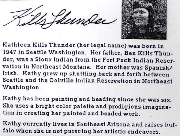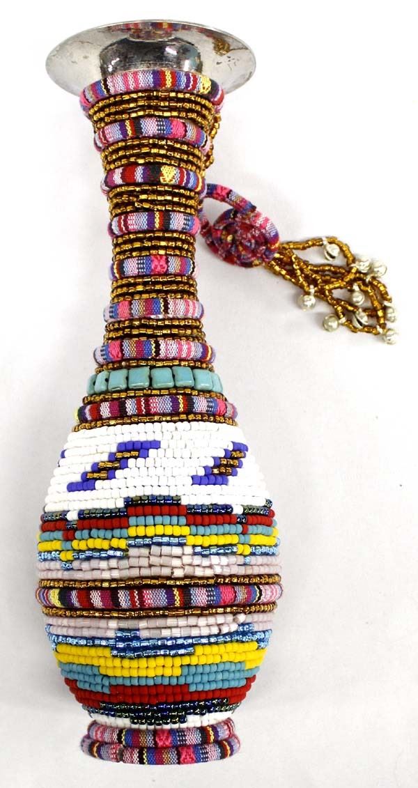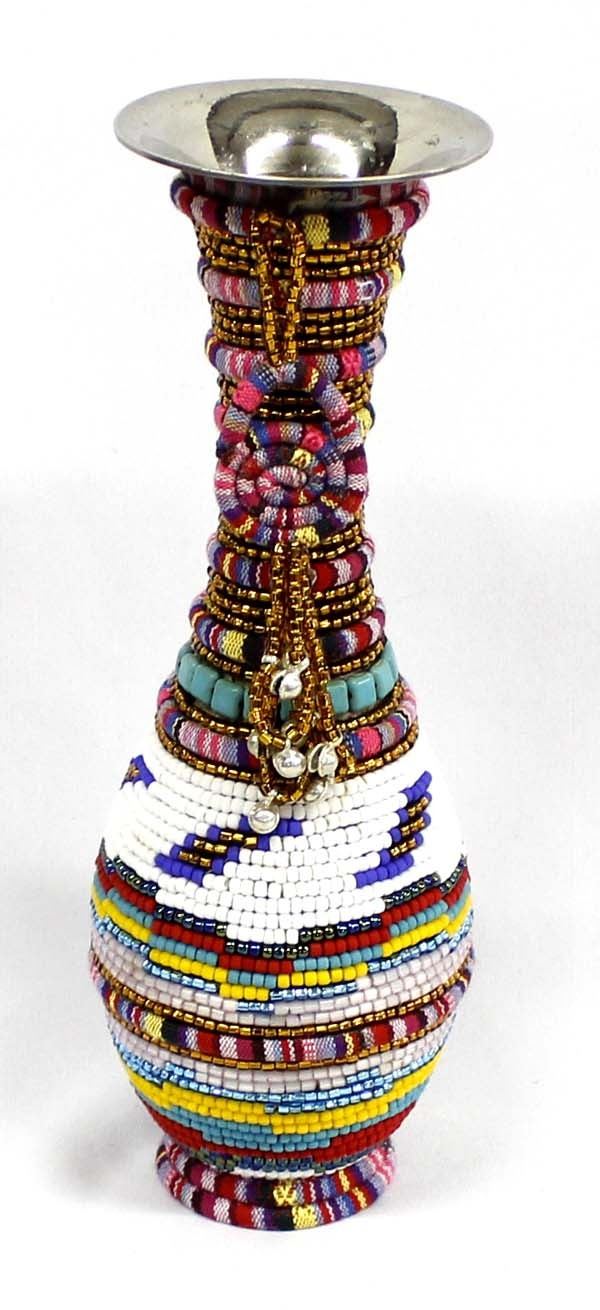 Hand Beaded Metal Vase by Kathy Kills Thunder, measures 3.5'' x 11'', embellished with beaded dangles and cloth rope design, she incorporated beadwork and colorful cloth rope on this piece, beautifully beaded in vibrant colors, Artist Bio: Kathleen Kills Thunder (her legal name) was born in 1947 in Seattle, WA. Her father, Ben Kills Thunder, was a Sioux Indian from the Fort Peck Indian Reservation in NE Montana and her mother was Spanish/Irish. Kathy has been painting and beading since she was six.