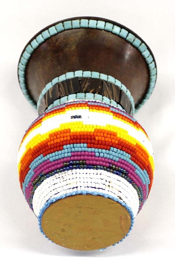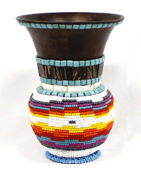 Hand Beaded Metal Vase by Kathy Kills Thunder, measures 6'' x 8.25'', beautifully beaded in vibrant colors, Artist Bio: Kathleen Kills Thunder (her legal name) was born in 1947 in Seattle, WA. Her father, Ben Kills Thunder, was a Sioux Indian from the Fort Peck Indian Reservation in NE Montana and her mother was Spanish/Irish. Kathy has been painting and beading since she was six.