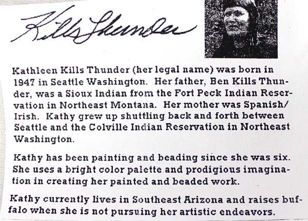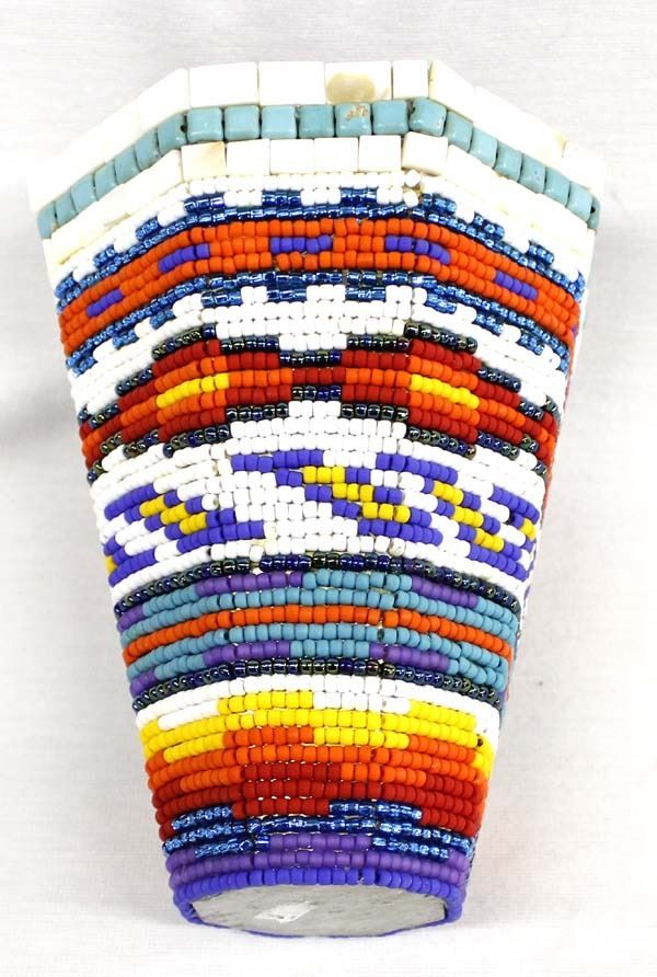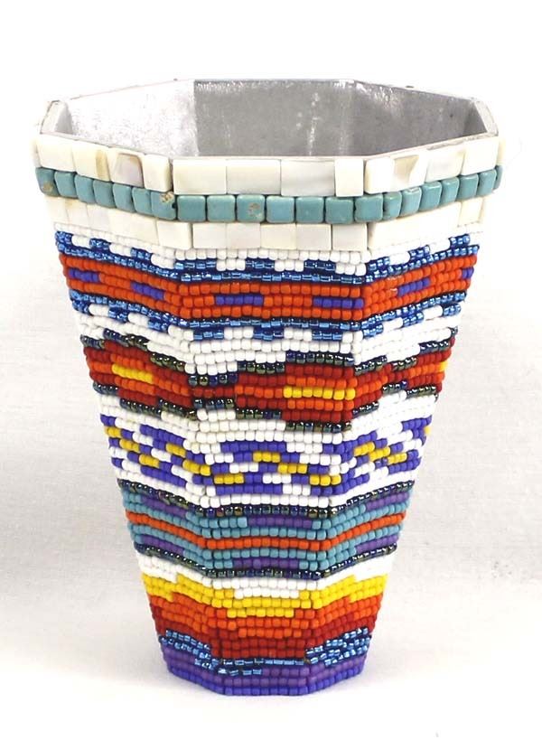 Hand Beaded Metal Vase by Kathy Kills Thunder, measures 5.5'' x 7''H, tab bead accents, beautiful vibrant colors, Artist Bio: Kathleen Kills Thunder (her legal name) was born in 1947 in Seattle, WA. Her father, Ben Kills Thunder, was a Sioux Indian from the Fort Peck Indian Reservation in NE Montana and her mother was Spanish/Irish. Kathy has been painting and beading since she was six.
