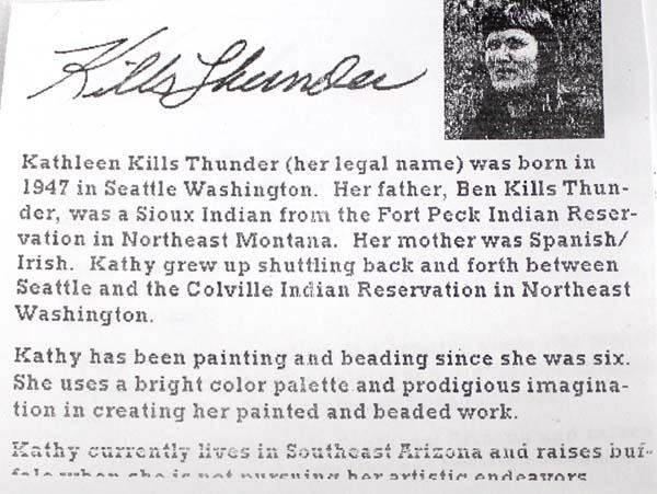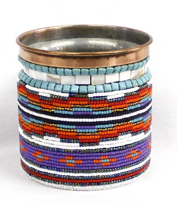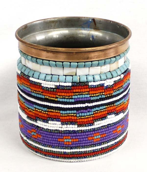 Hand Beaded Metal Vase by Kathy Kills Thunder, measures 6'' x 6'', beautiful colors, Artist Bio: Kathleen Kills Thunder (her legal name) was born in 1947 in Seattle, WA. Her father, Ben Kills Thunder, was a Sioux Indian from the Fort Peck Indian Reservation in NE Montana and her mother was Spanish/Irish. Kathy has been painting and beading since she was six.