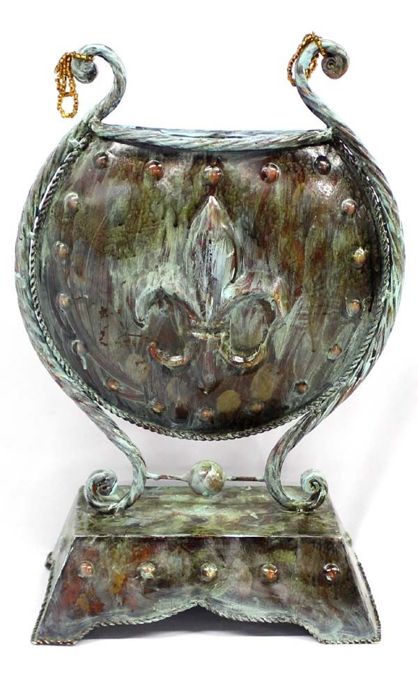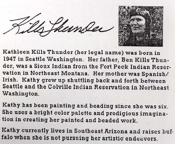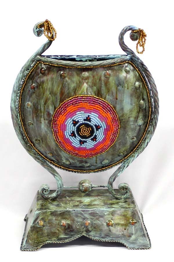 Hand Beaded Metal Vase by Kills Thunder, measures 17'' x 11'' x 6.5'', beautifully beaded in bright colors and patterns, Artist Bio: Kathleen Kills Thunder (her legal name) was born in 1947 in Seattle, WA. Her father, Ben Kills Thunder, was a Sioux Indian from the Fort Peck Indian Reservation in NE Montana. Her mother was Spanish/Irish. Kathy grew up shuttling back and forth between Seattle and the Colville Indian Reservation in NE Washington. Kathy has been painting and beading since she was six. She uses a bright color palette and prodigious imagination in creating her painted and beaded work. Kathy currently lives in SE Arizona and raises buffalo when she is not pursuing her artistic endeavors.
