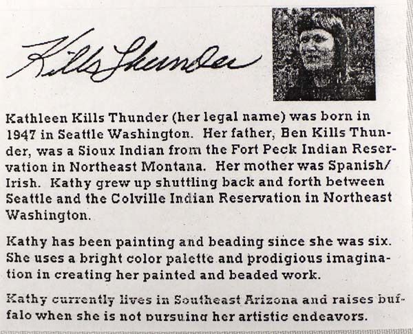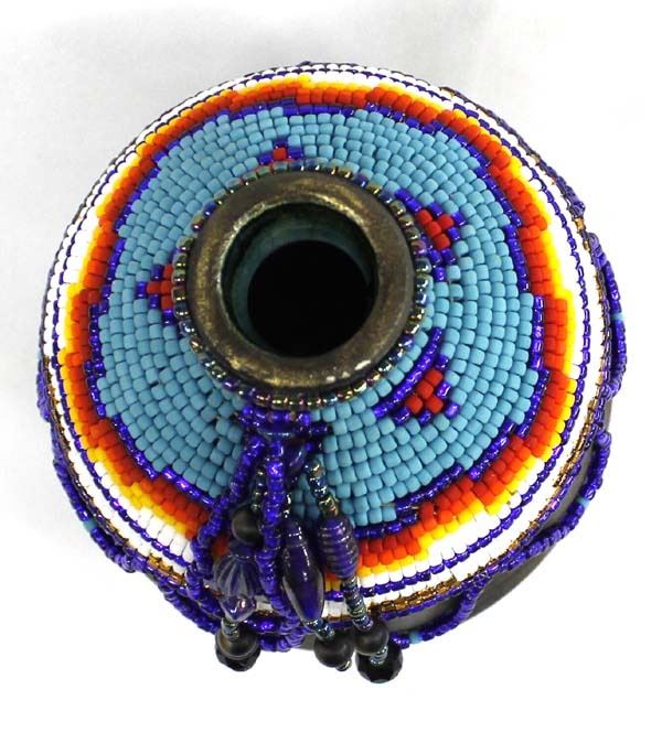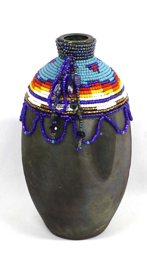 Hand Beaded Raku Pottery Vase by Kathy Kills Thunder, measures 10'' x 5'', vibrant colors, beaded dangle accents, the Raku vase is by artist Michael Weinberg and is signed on the bottom, Artist Bio: Kathleen Kills Thunder (her legal name) was born in 1947 in Seattle, WA. Her father, Ben Kills Thunder, was a Sioux Indian from the Fort Peck Indian Reservation in NE Montana. Her mother was Spanish/Irish. Kathy grew up shuttling back and forth between Seattle and the Colville Indian Reservation in NE Washington. Kathy has been painting and beading since she was six. She uses a bright color palette and prodigious imagination in creating her painted and beaded work. Kathy currently lives in SE Arizona and raises buffalo when she is not pursuing her artistic endeavors.