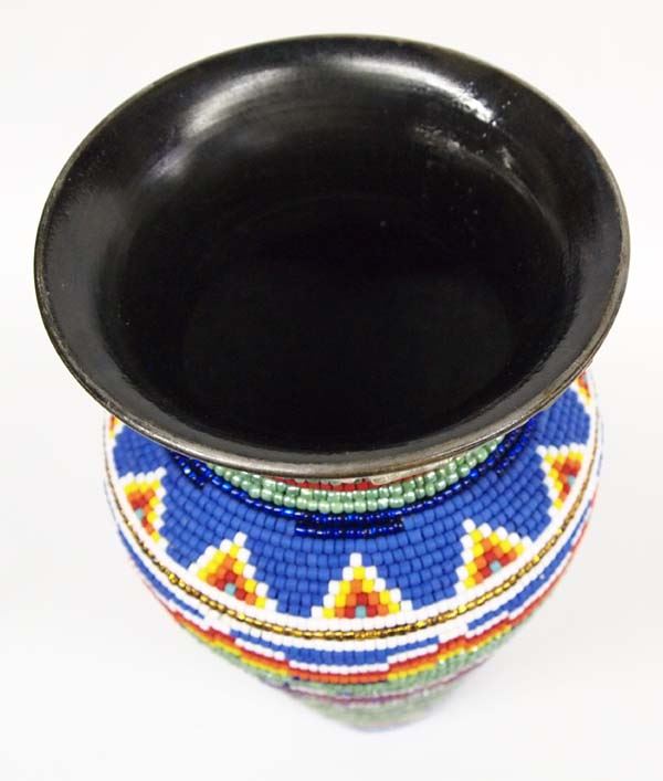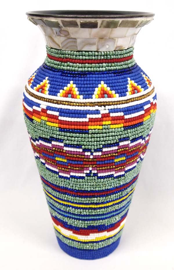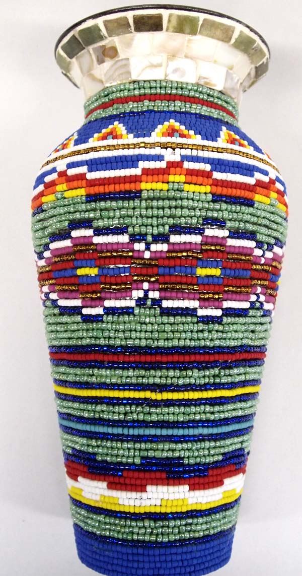 Hand Beaded Vase by Kathy Kills Thunder, measures 7''D x 12''H, beautifully beaded in predominantly cool colors, the neck of the vase has grouted mother of pearl tab beads, Artist Bio: Kathleen Kills Thunder (her legal name) was born in 1947 in Seattle, WA. Her father, Ben Kills Thunder, was a Sioux Indian from the Fort Peck Indian Reservation in NE Montana. Her mother was Spanish/Irish. Kathy grew up shuttling back and forth between Seattle and the Colville Indian Reservation in NE Washington. Kathy has been painting and beading since she was six. She uses a bright color palette and prodigious imagination in creating her painted and beaded work. Kathy currently lives in SE Arizona and raises buffalo when she is not pursuing her artistic endeavors.