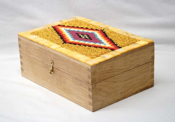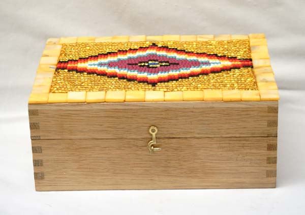 Hand Beaded Wood Box by Kathy Kills Thunder, measures 8'' x 3'' x 5.5'', vibrant colors, Artist Bio: Kathleen Kills Thunder (her legal name) was born in 1947 in Seattle, WA. Her father, Ben Kills Thunder, was a Sioux Indian from the Fort Peck Indian Reservation in NE Montana. Her mother was Spanish/Irish. Kathy grew up shuttling back and forth between Seattle and the Colville Indian Reservation in NE Washington. Kathy has been painting and beading since she was six. She uses a bright color palette and prodigious imagination in creating her painted and beaded work. Kathy currently lives in SE Arizona and raises buffalo when she is not pursuing her artistic endeavors.